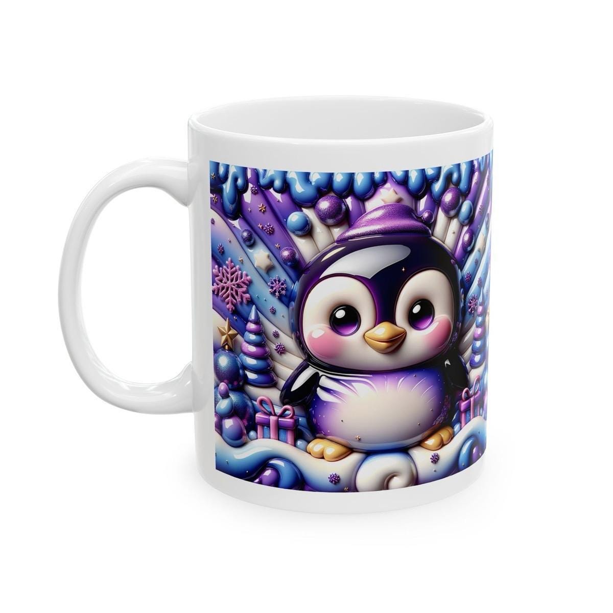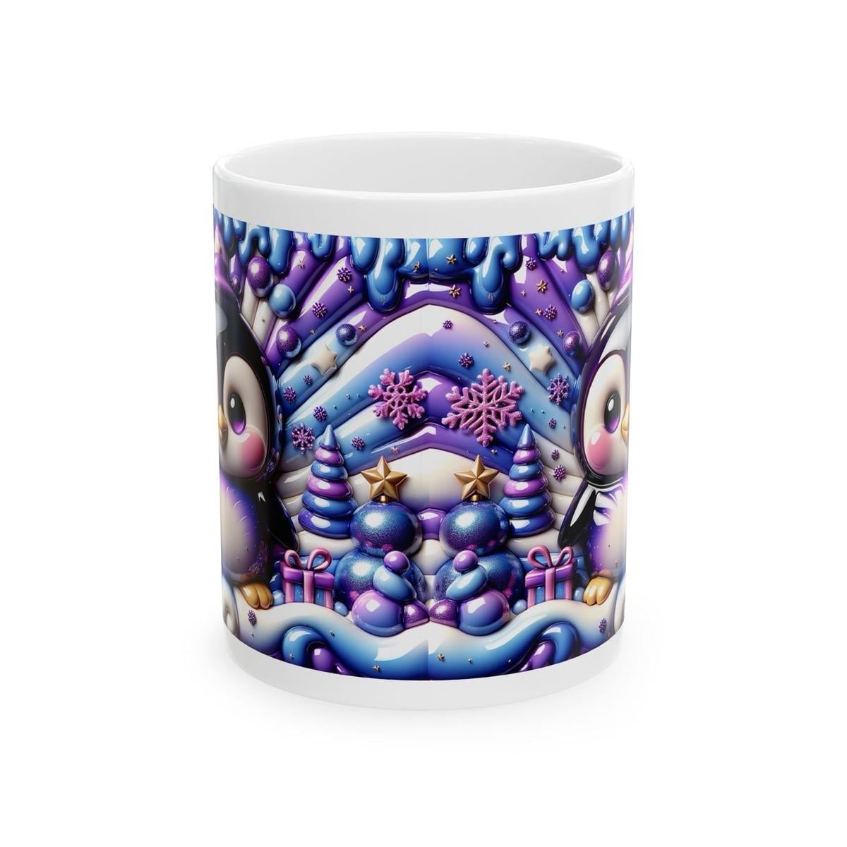 3d quilted sparkly festive baby penguin mug - cozy holiday design with blue and purple accents - perfect christmas gift drinkware reusable