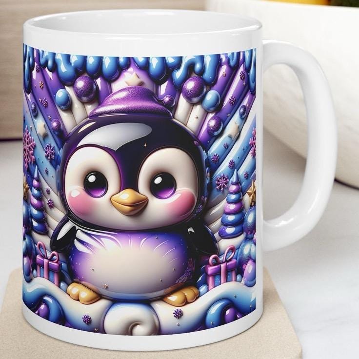 This Festive baby Penguin Mug is a perfect addition to your holiday collection. The 3D quilted design adds texture and depth to the mug, making it more visually appealing and unique. The sparkly finish adds a touch of glamour and sparkle to the mug, making it stand out and catch the eye. The Festive design is perfect for the holiday season, featuring a baby Penguin and other festive elements. The blue and purple accents add a pop of color and contrast to the design, making it more eye-catching and attractive.