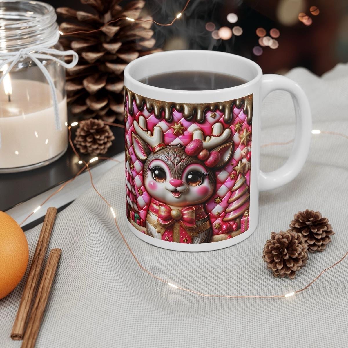 Introducing the Festive Deer Mug, a 3D quilted mug that is perfect for the holiday season. The mug features a sparkly design that adds a touch of glamour to your morning coffee or tea. The pink and brown accents on the mug create a cozy and warm atmosphere, making it a great addition to your holiday decor.