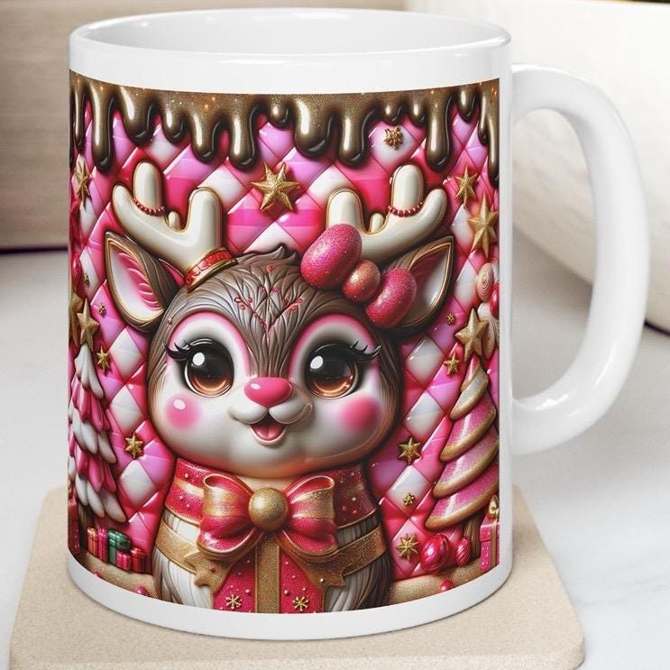 3d quilted sparkly pink festive deer mug - cozy holiday design with pink and brown accents - perfect christmas gift drinkware reuse reusable