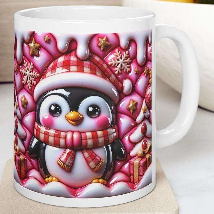 The 3D quilted design on the mug provides a unique and textured look, making it stand out from other mugs. The Festive Penguin design on the mug is perfect for the holiday season, adding a fun and playful touch to your holiday decor. The pink and white accents on the mug add a pop of color and complement the Festive Penguin design, creating a cohesive and harmonious look.