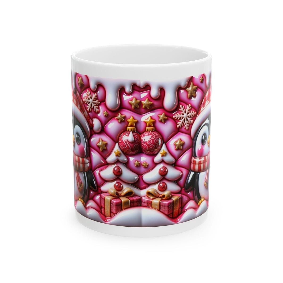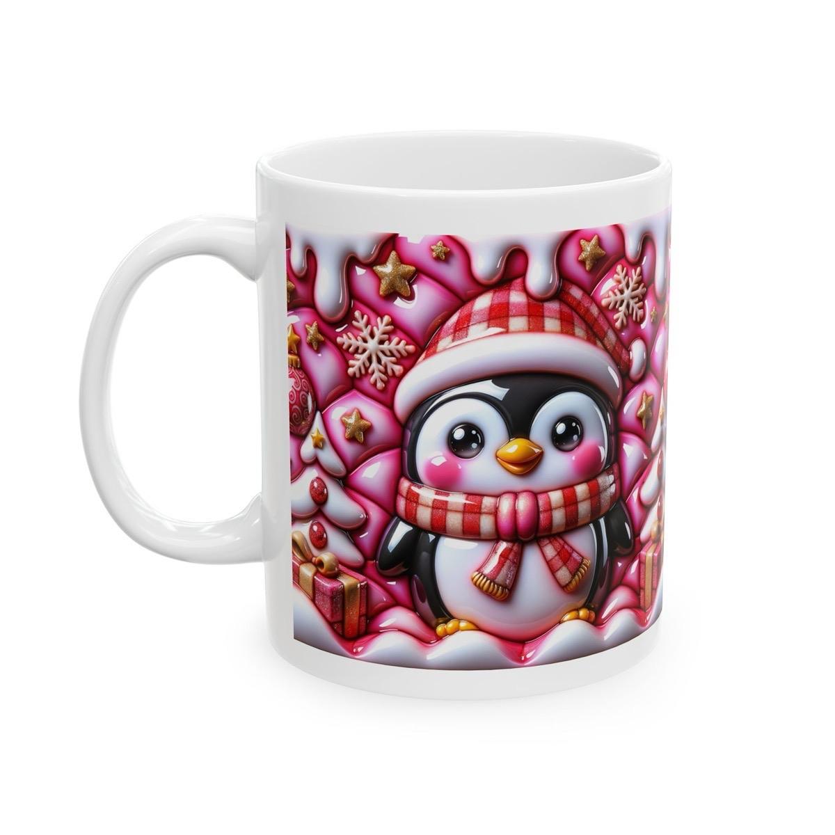 3d quilted sparkly pink festive penguin mug - cozy holiday design with pink and white accents - perfect christmas gift drinkware reuse reusa