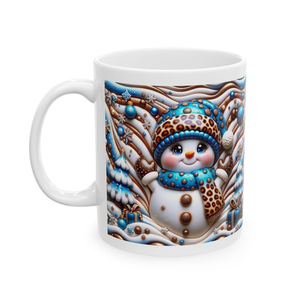 Introducing the 3D Snowman Christmas Mug, a perfect festive gift for the holiday season. This mug features a cozy winter design with blue and gold accents that add a touch of elegance and sophistication to the festive atmosphere. The 3D design of the snowman on the mug adds depth and dimension, making it more visually appealing and interesting to look at.