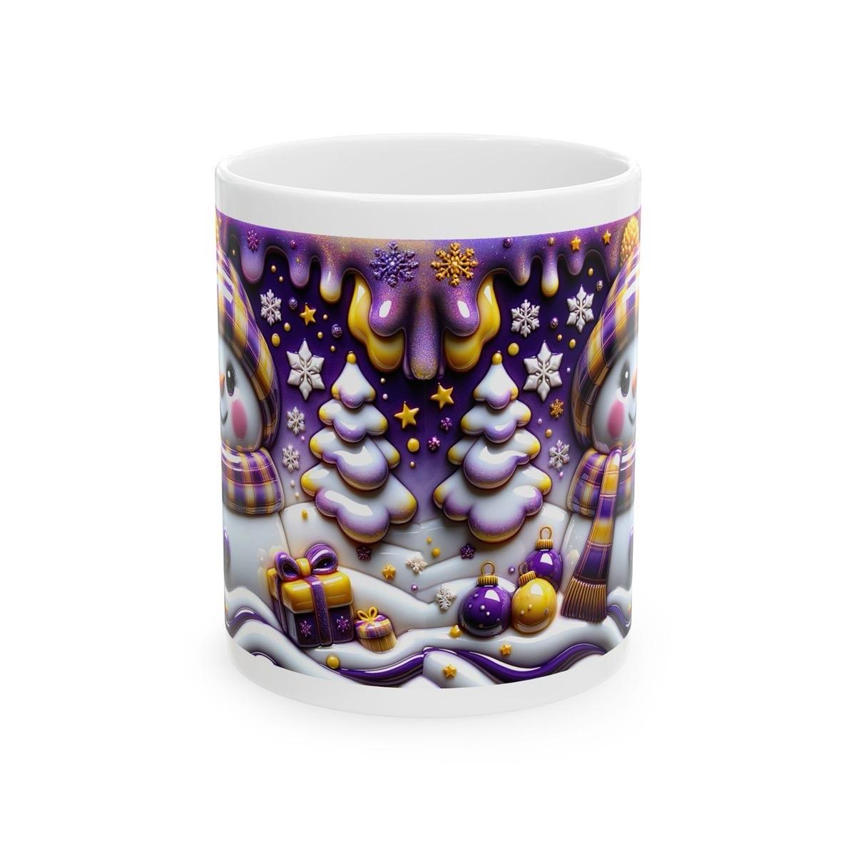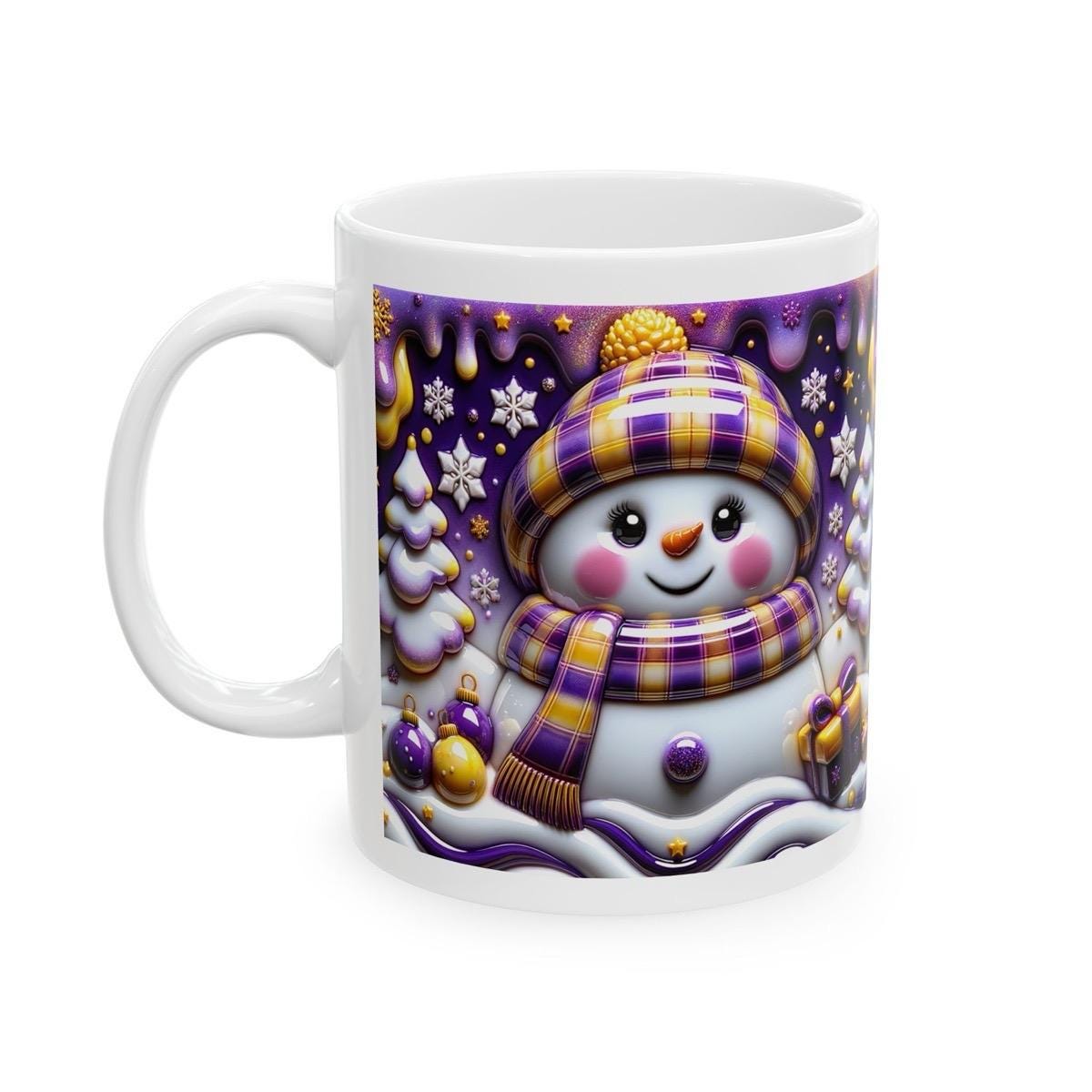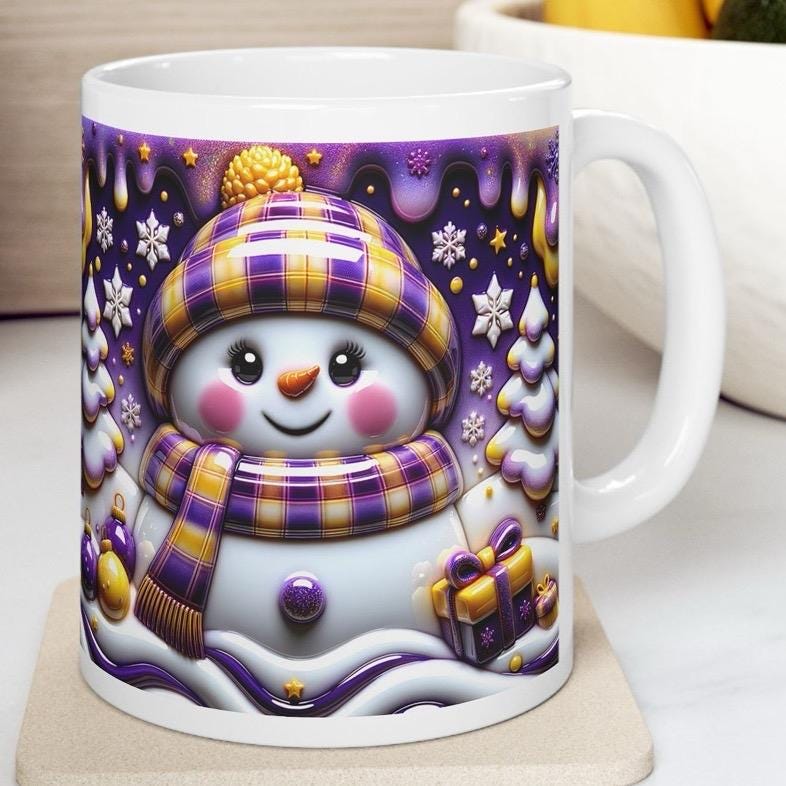 The 3D Snowman Christmas Mug is a festive and unique addition to your holiday season. The mug features a 3D snowman design that adds depth and dimension to the design, making it stand out from other mugs. The cozy purple and gold accents on the mug add a warm and inviting feel to the mug, making it a great choice for the holiday season.