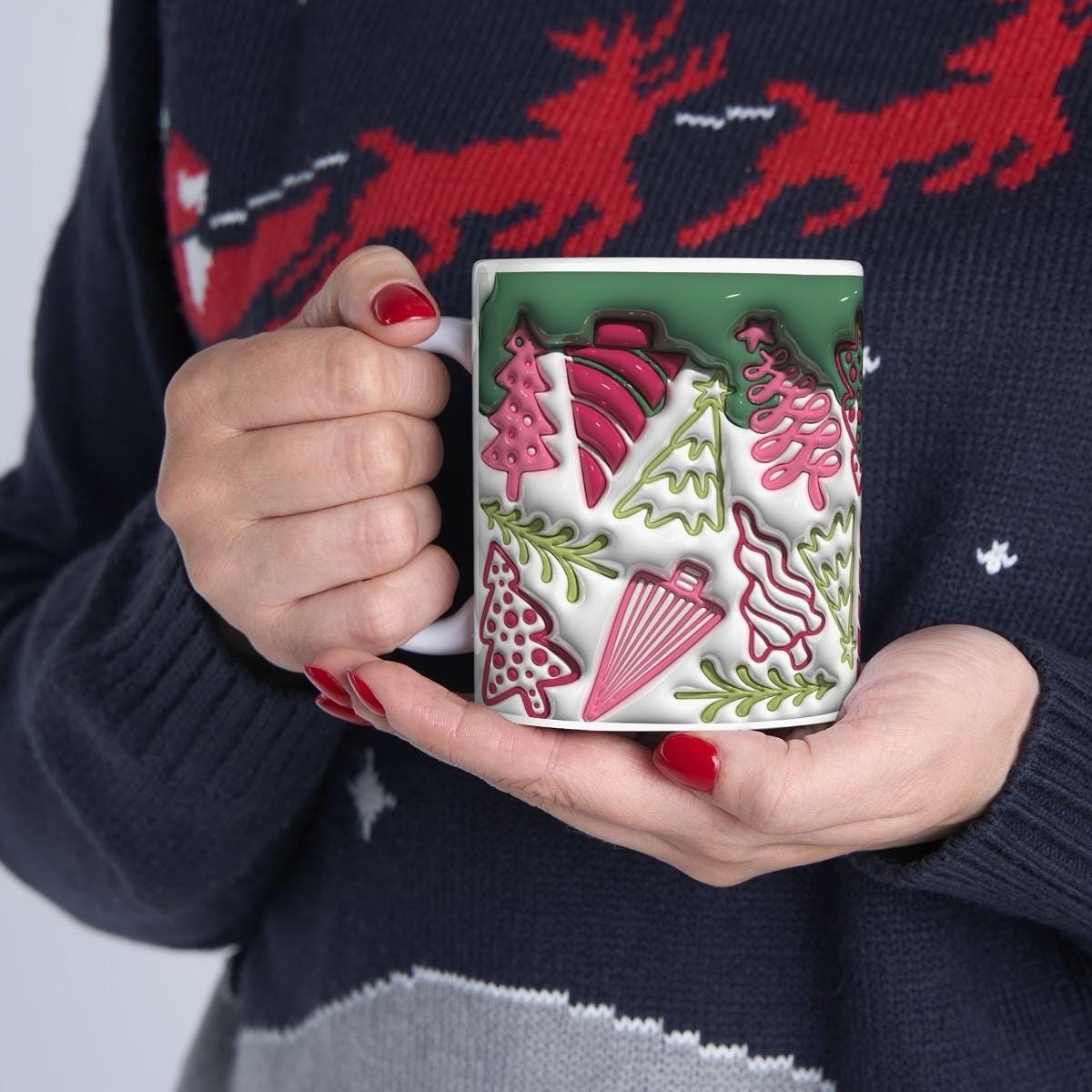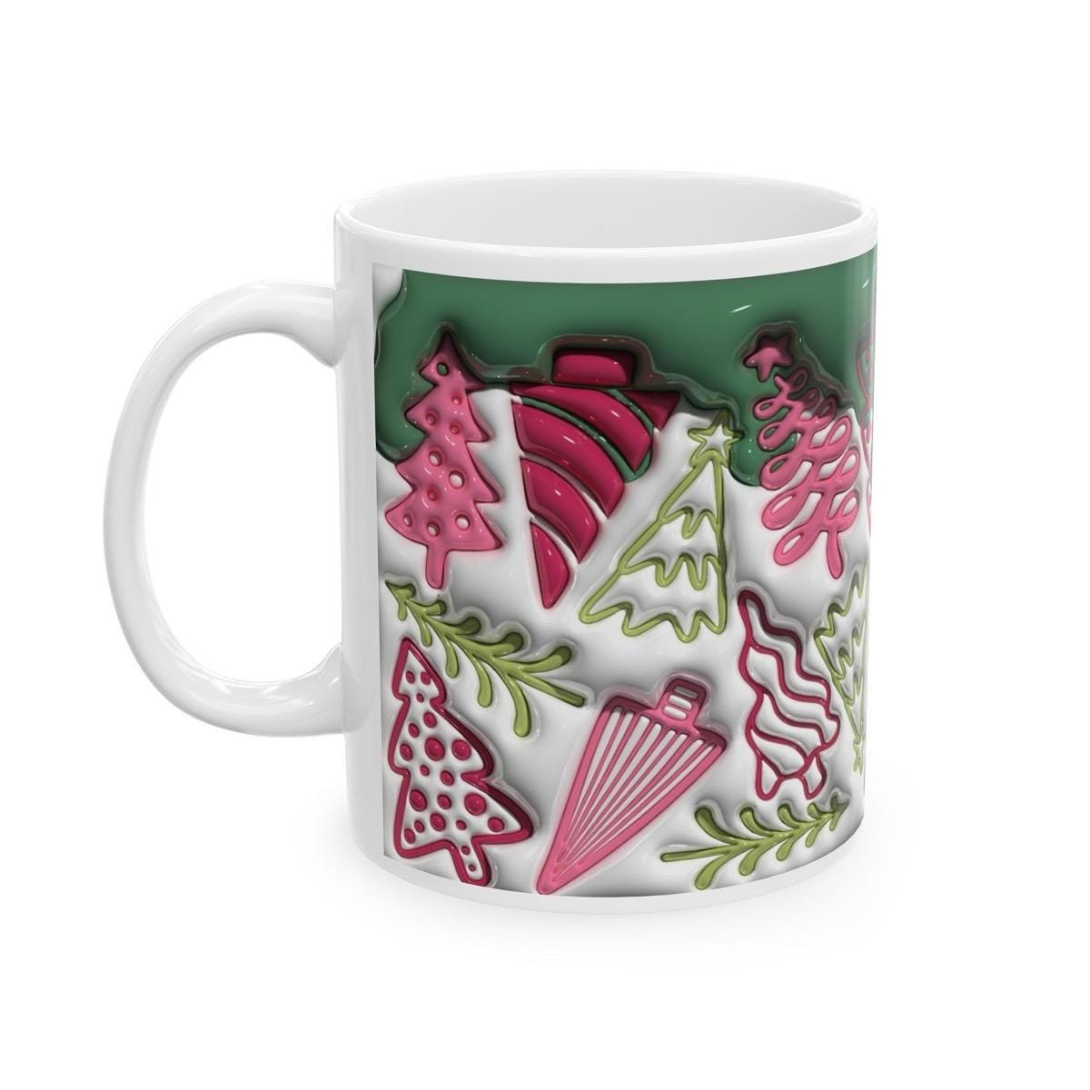The mug is perfect for enjoying your favorite hot beverages, such as coffee or tea, during the holiday season. The 3D style design adds a festive touch to your morning routine, making it a great gift for friends and family who love the holiday season. The mug is made of durable ceramic material that is easy to clean and maintain, ensuring that it will last for many holiday seasons to come.