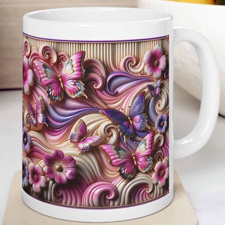 Introducing our 3D swirled butterfly design mug, a perfect addition to your kitchenware collection. This mug features a unique and eye-catching design that is sure to impress your guests. The 3D swirled butterfly design adds depth and dimension to the mug, making it stand out from other mugs.