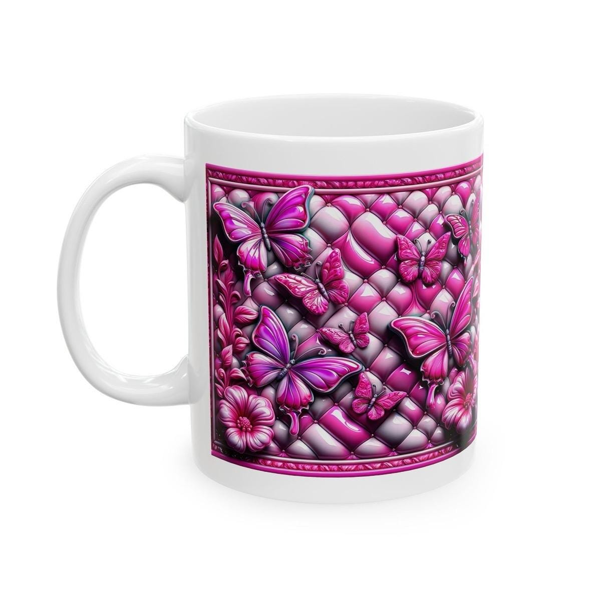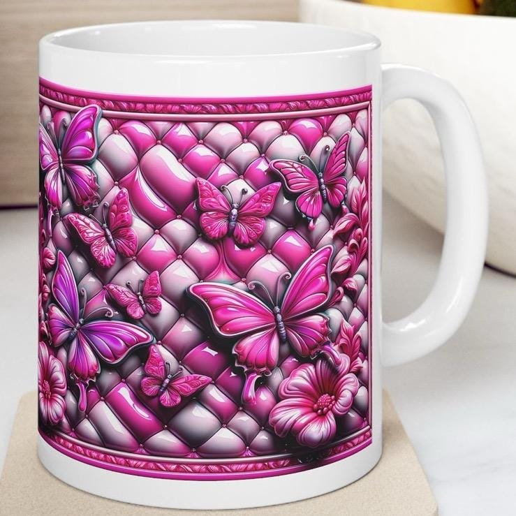 In conclusion, the Bright Pink Quilted Butterfly Flower 3D Mug is a unique and visually appealing addition to your mug collection. The bright pink color, quilted design, and 3D effect of the design make it stand out from other mugs. The butterfly and flower design on the mug adds a decorative element to the mug, making it more visually appealing.