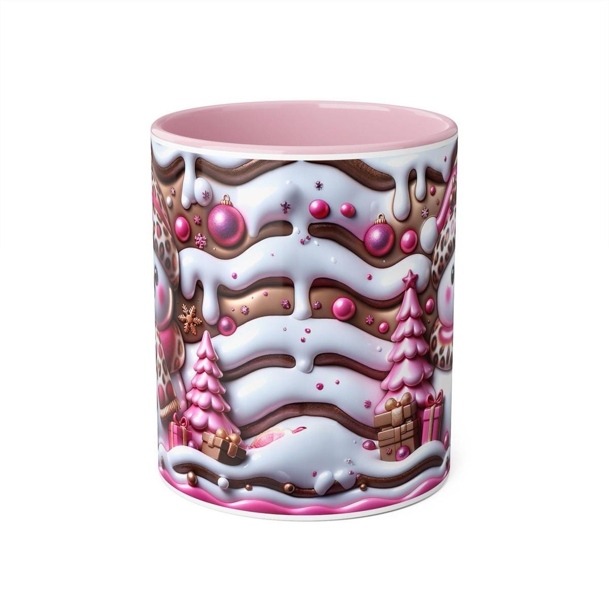The interior of the mug is a beautiful shade of pink, which adds a pop of color to the design. The handle of the mug is also pink, providing a comfortable grip for easy handling. The pink color of the interior and handle of the mug makes it stand out from other mugs and adds a touch of fun to your holiday decor.