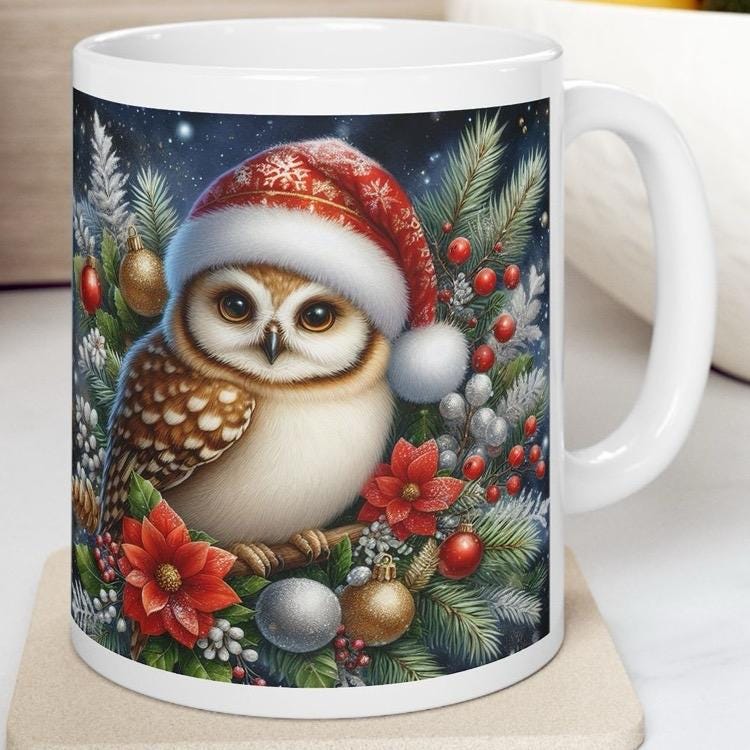 This Christmas owl mug is the perfect addition to your holiday season. The mug features a cute and festive owl design that is sure to bring a smile to your face every time you use it. The mug is made of durable ceramic material that is easy to clean, ensuring that it will last for many Christmases to come.