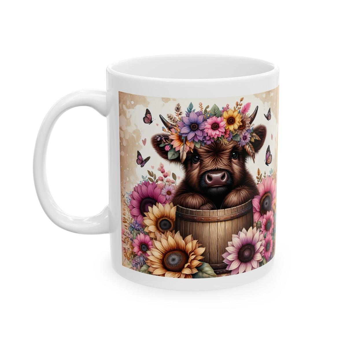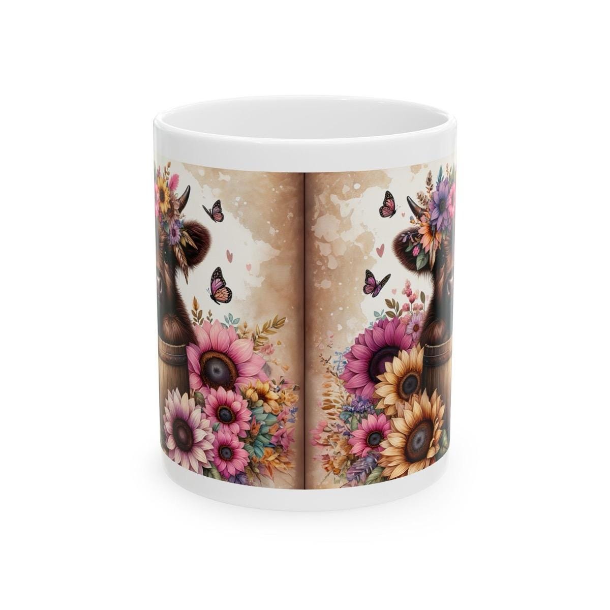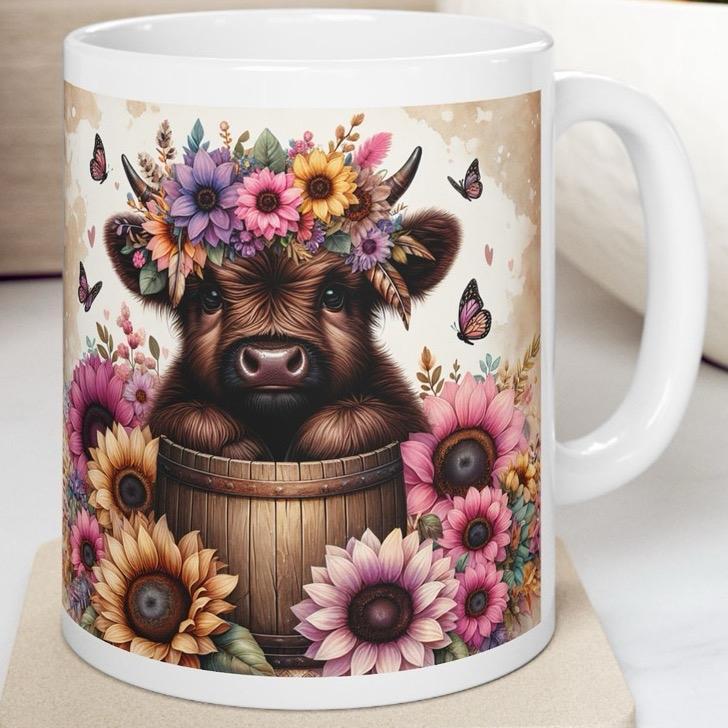 This 3D mug is a fun and unique way to enjoy your favorite hot beverages. The mug features a cute flowery Highland cow design that adds a touch of whimsy to your morning routine. The design is printed in 3D, making it stand out from other mugs and adding a three-dimensional element to the design.