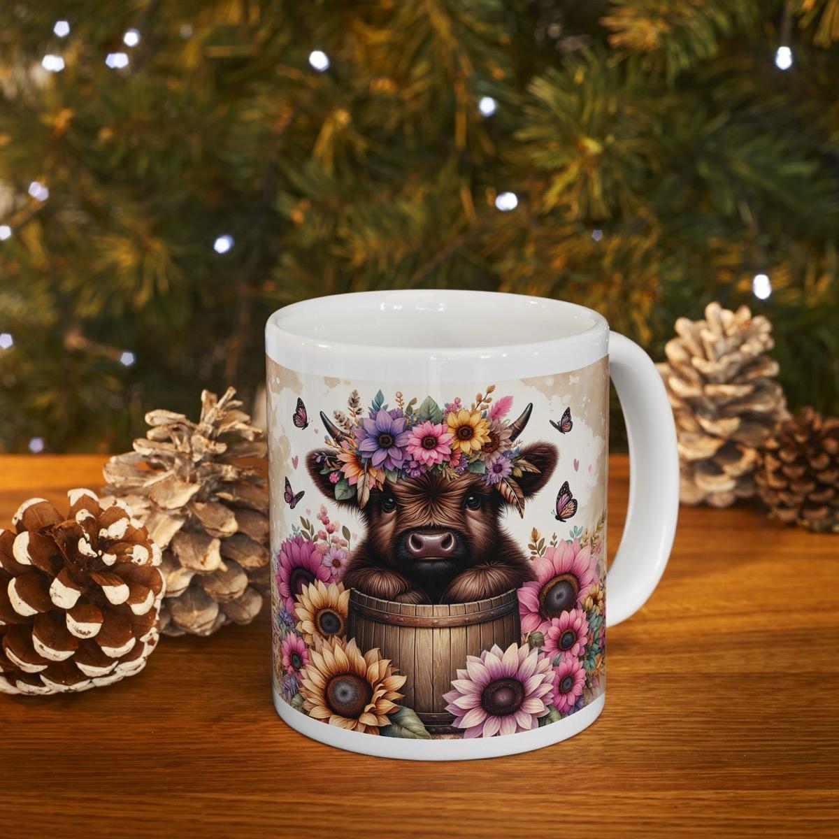 Cute flowery highland cow in barrel 3d mug - perfect for your morning drinks - drinkware, tumblers washable cup reusable coffee ceramic reus