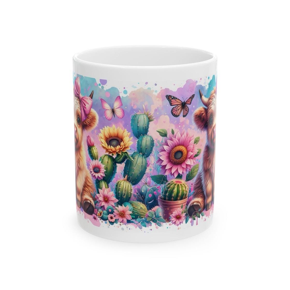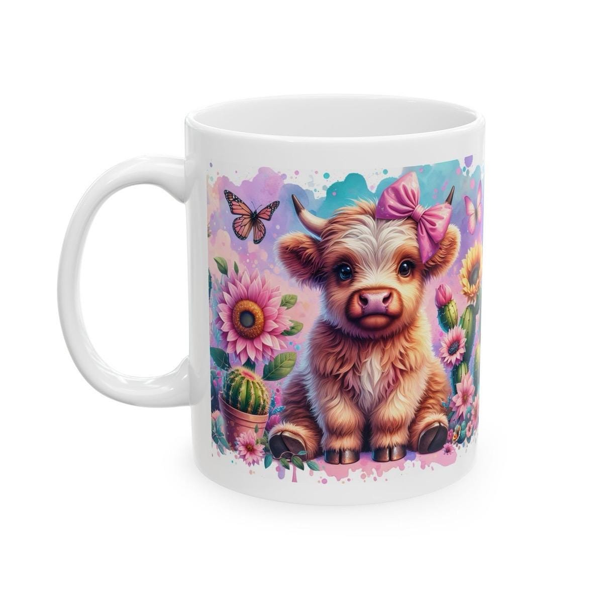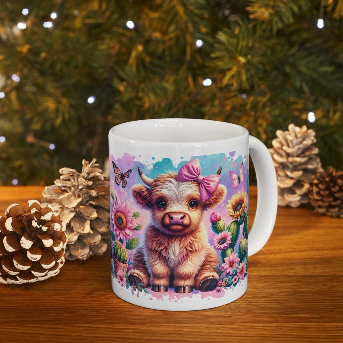 The mug is decorated with a pink bow and butterfly, which adds a touch of whimsy to the design. The pink bow and butterfly are a perfect complement to the Highland Cow design, making the mug even more charming.