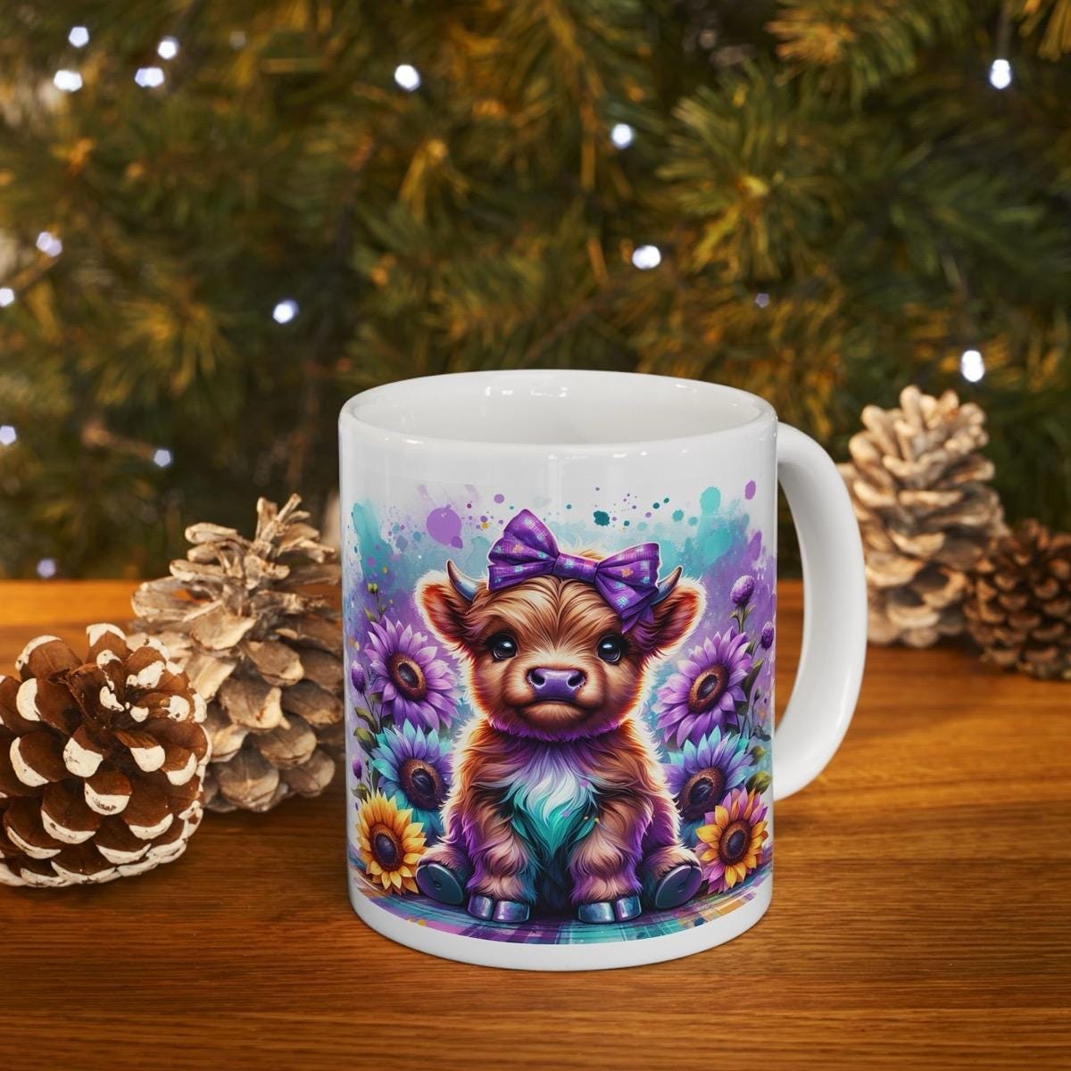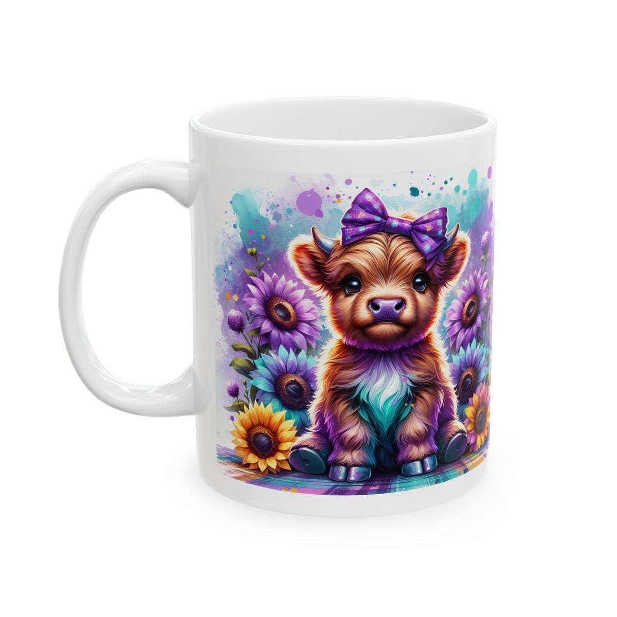 Whether you're a fan of cows or just looking for a fun and unique mug, this highland cow design is sure to bring a smile to your face. The purple bow adds a pop of color and a touch of whimsy to the design, making it a great gift for anyone who loves cows or cute animal designs.