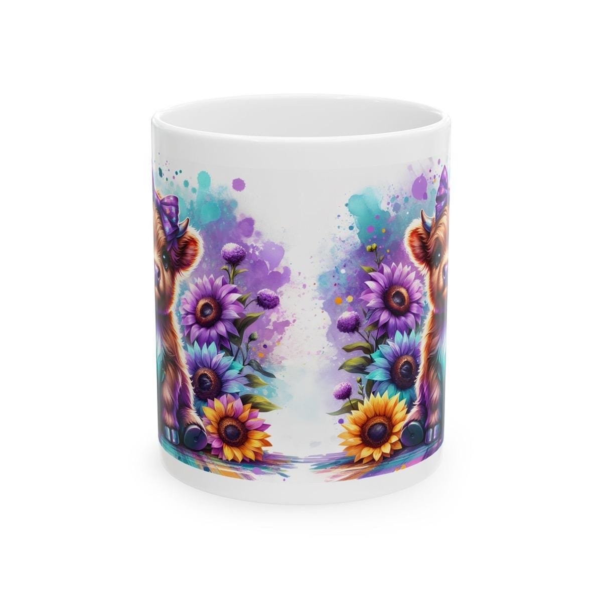 This 3D mug is a fun and unique way to enjoy your favorite hot beverages. The design features a cute highland cow with a purple bow, adding a playful touch to your morning routine. The 3D design also adds depth and dimension to the mug, making it more visually appealing and interesting to hold and drink from.