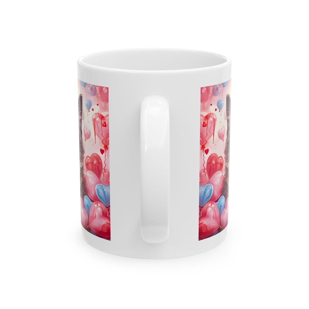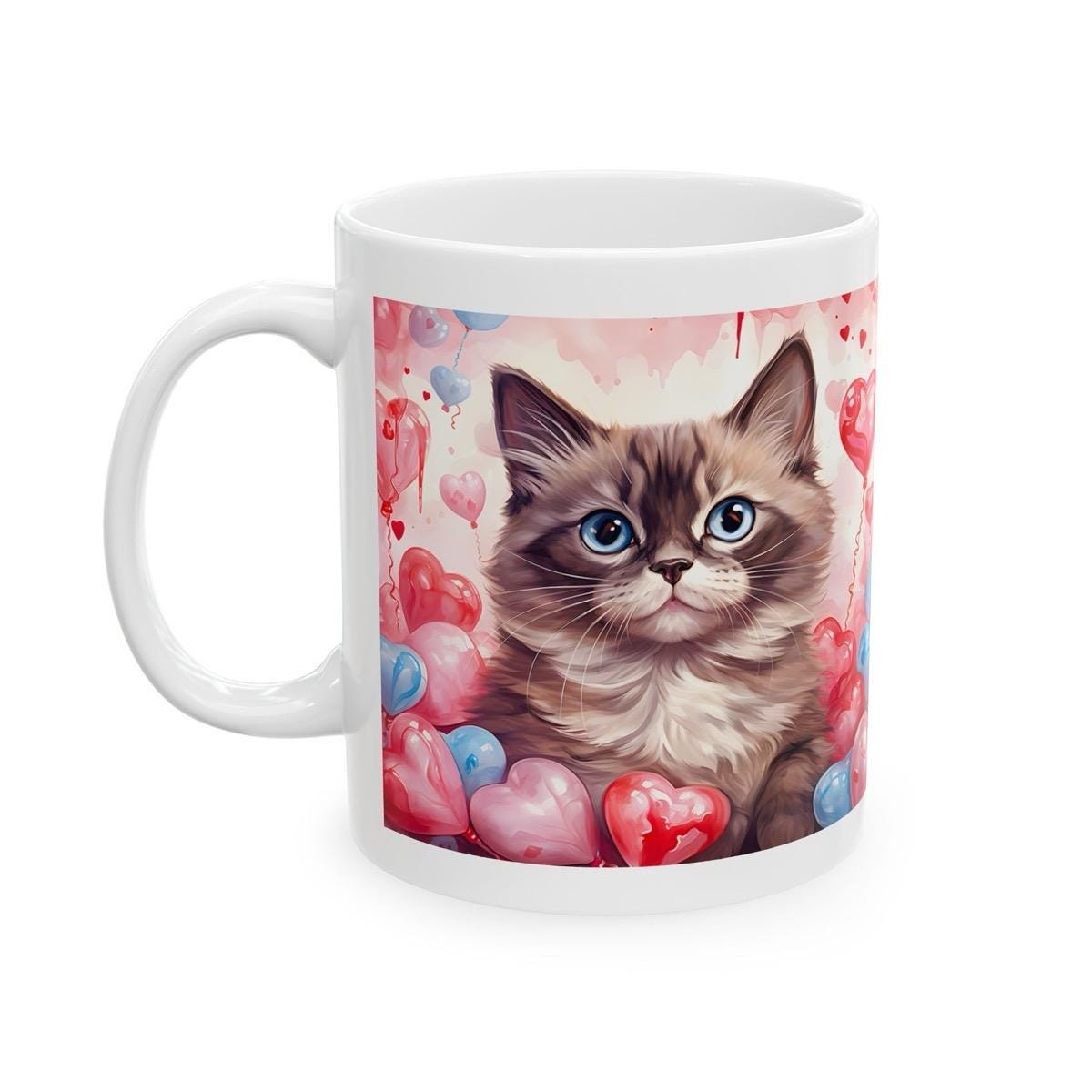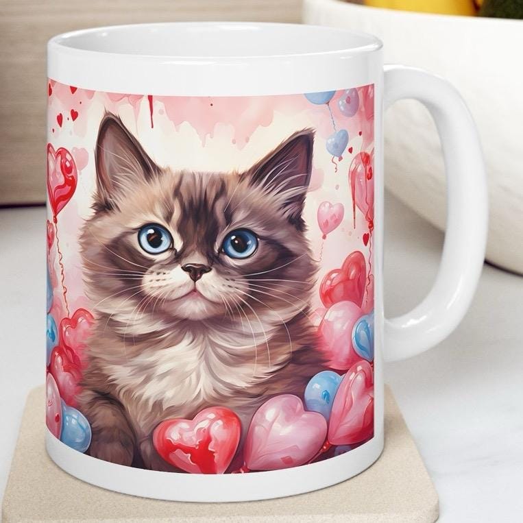 This cute kitten love heart mug is the perfect gift for anyone who loves cats or cute designs. The mug features a love heart design that adds a romantic touch to the mug, making it a great gift for Valentine's Day or Secret Santa. The kitten design is cute and playful, making it a great addition to any collection.
