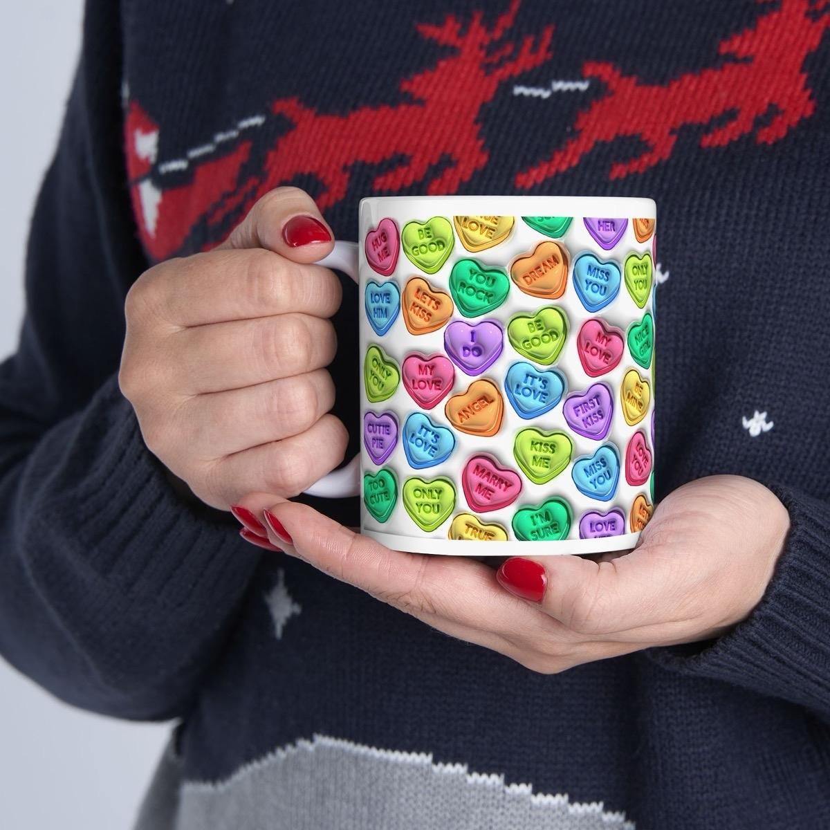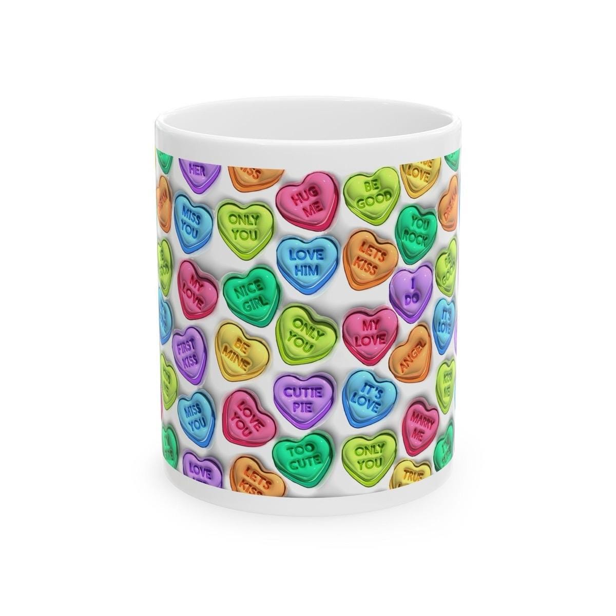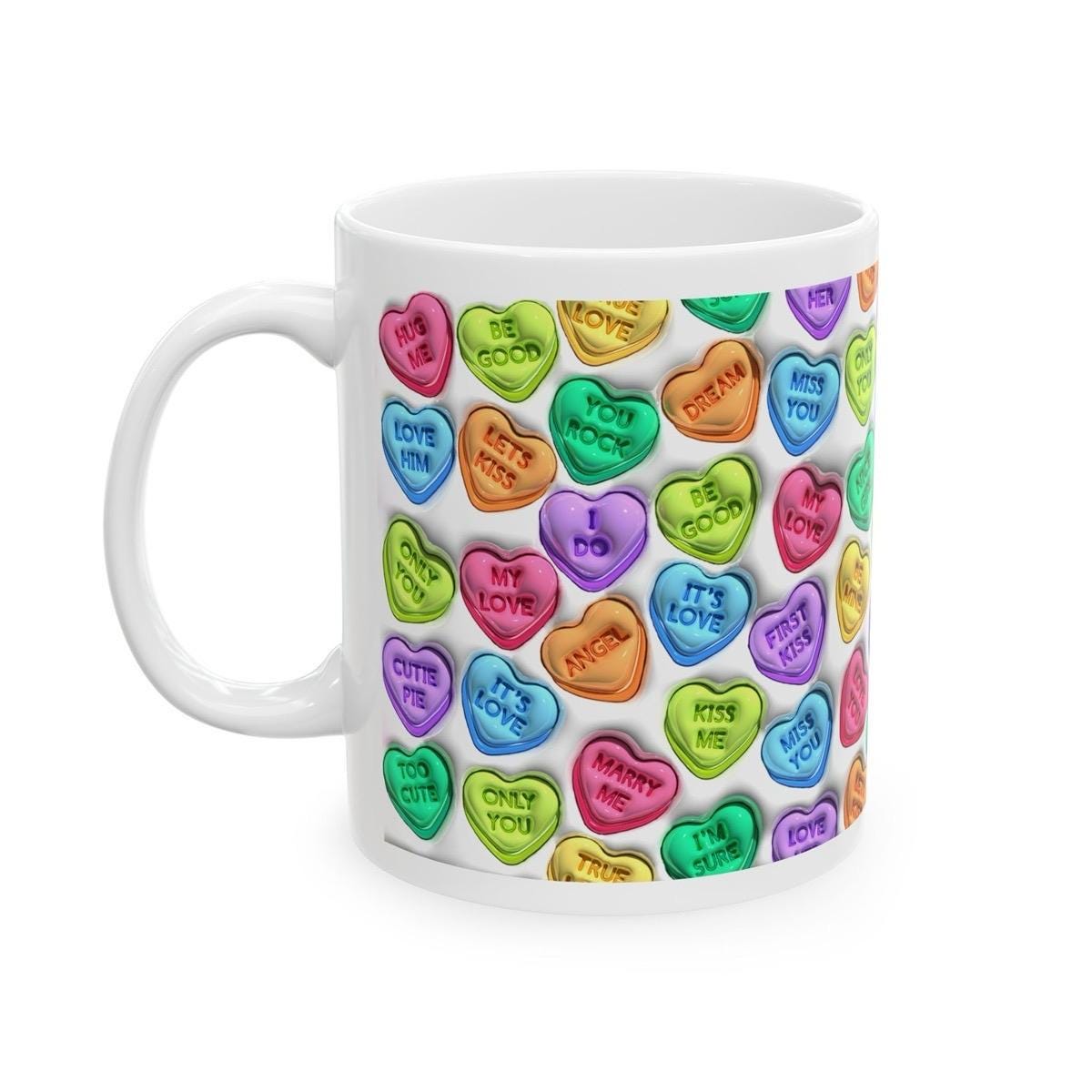 Whether you're enjoying a morning cup of coffee or tea, or using it as a pen holder on your desk, this Love Hearts Sweets Mug is sure to bring a smile to your face and add a touch of sweetness to your day.
