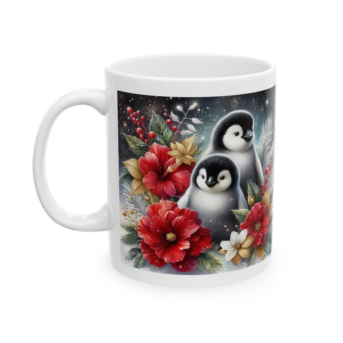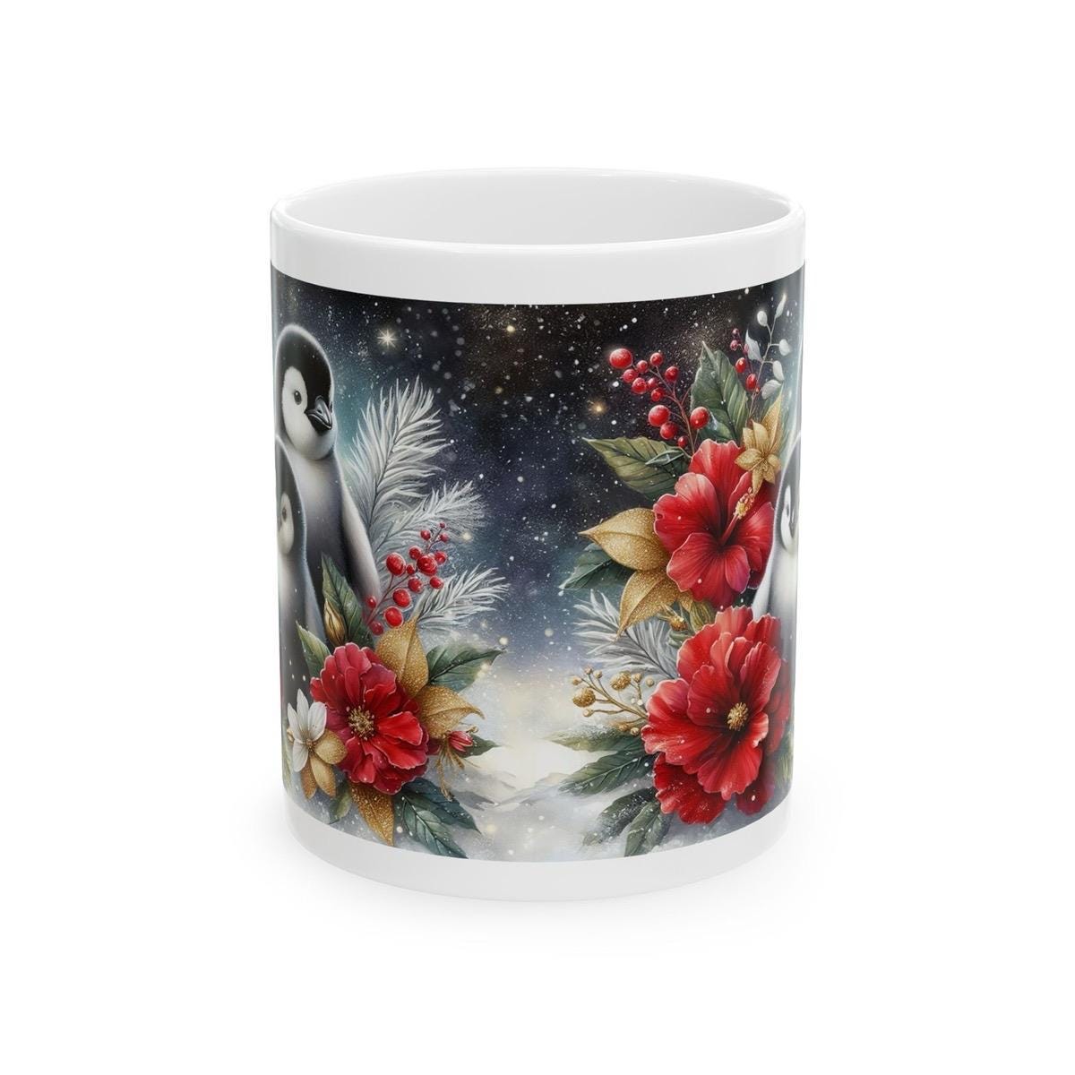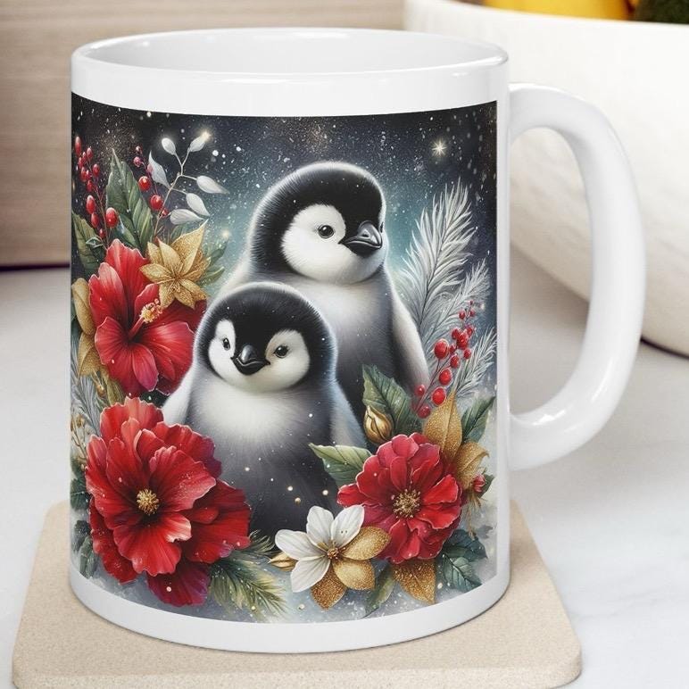 Cute penguins and flowers christmas mug - perfect for your morning drinks - drinkware tumbler coffee reusable cup reuse washable ceramic xma