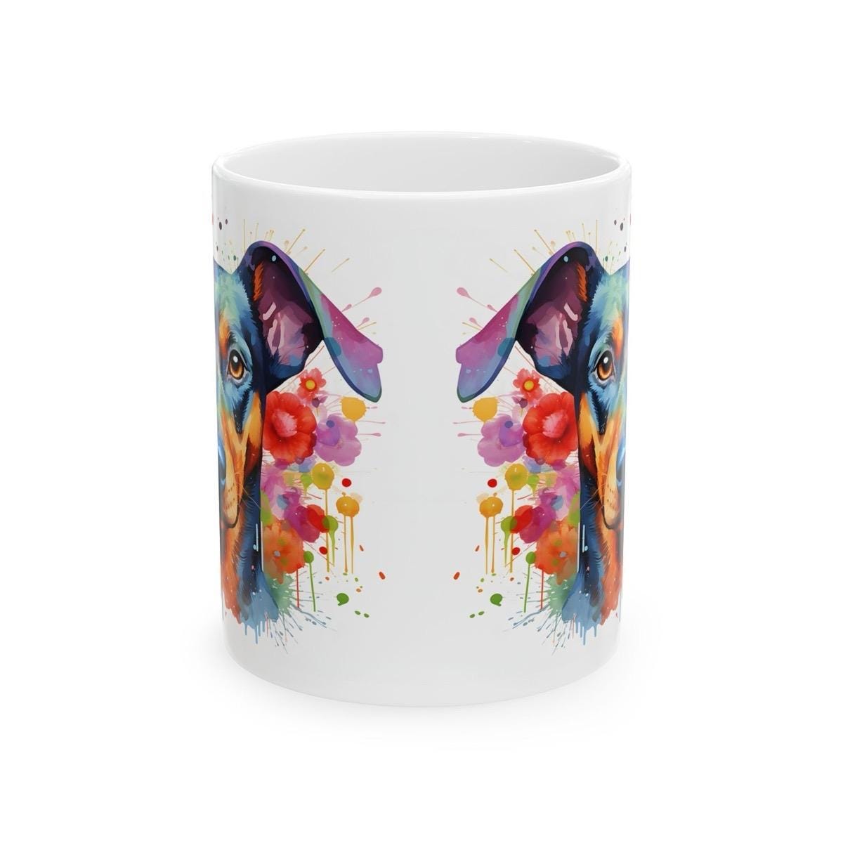 This Doberman dog Floral Art Mug is the perfect addition to your morning routine. Whether you're enjoying a cup of coffee or tea, this mug is sure to bring a smile to your face. The unique design features a Doberman dog with a beautiful floral art background, making it stand out from other mugs.