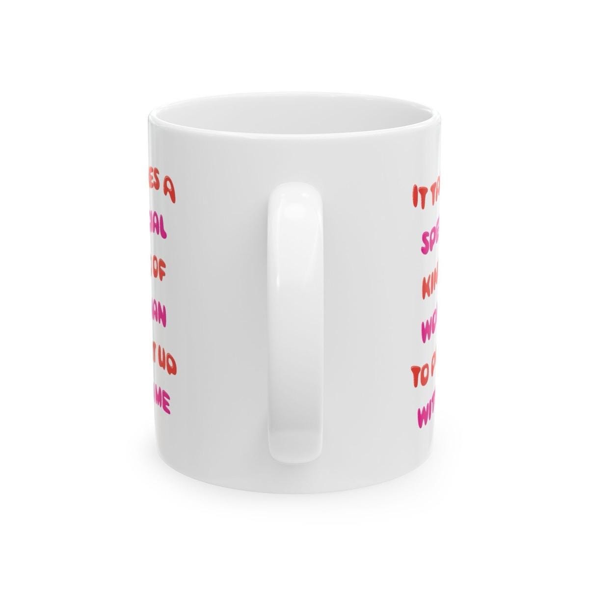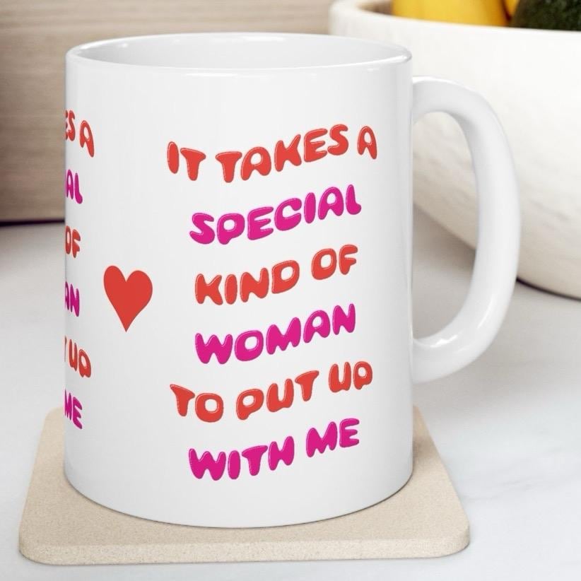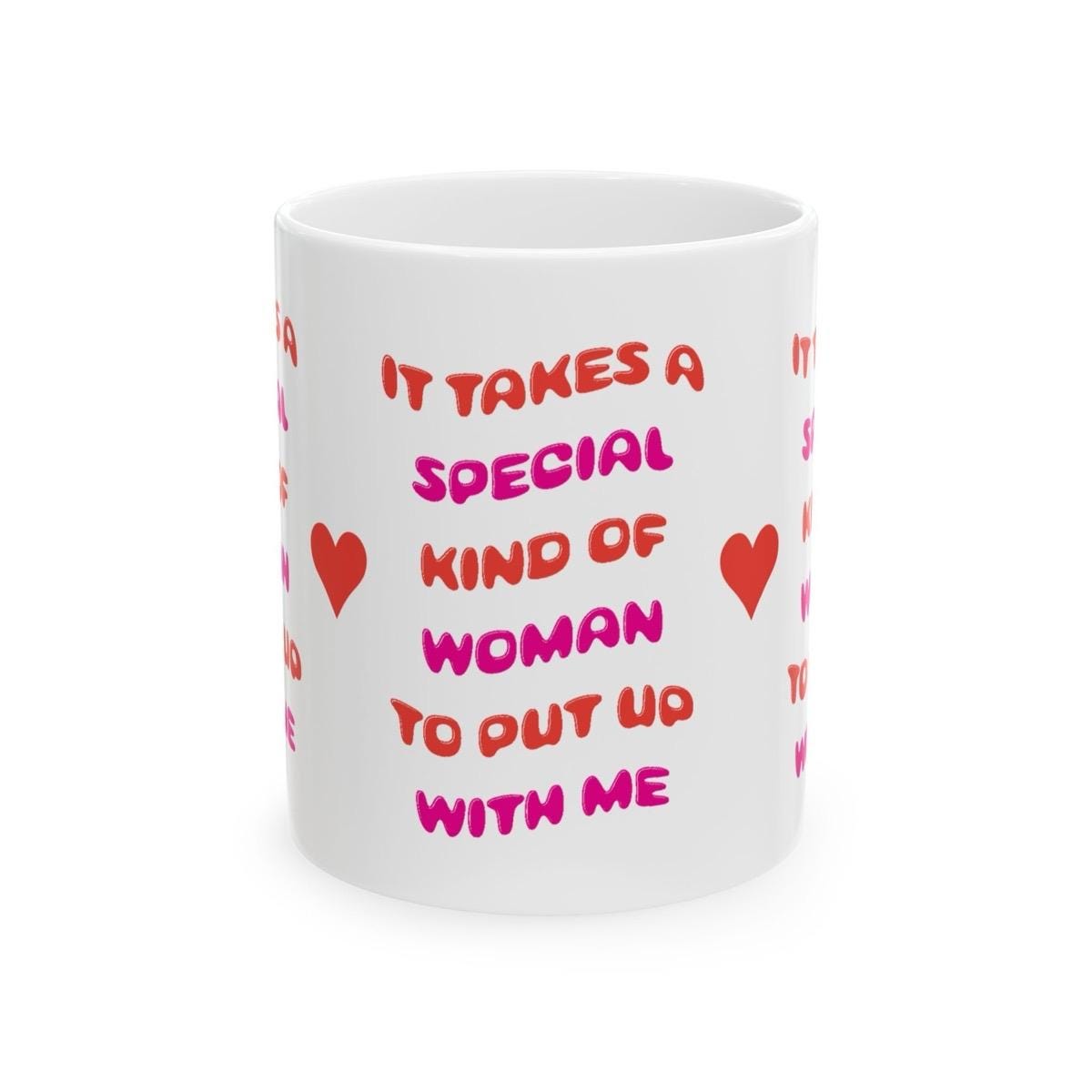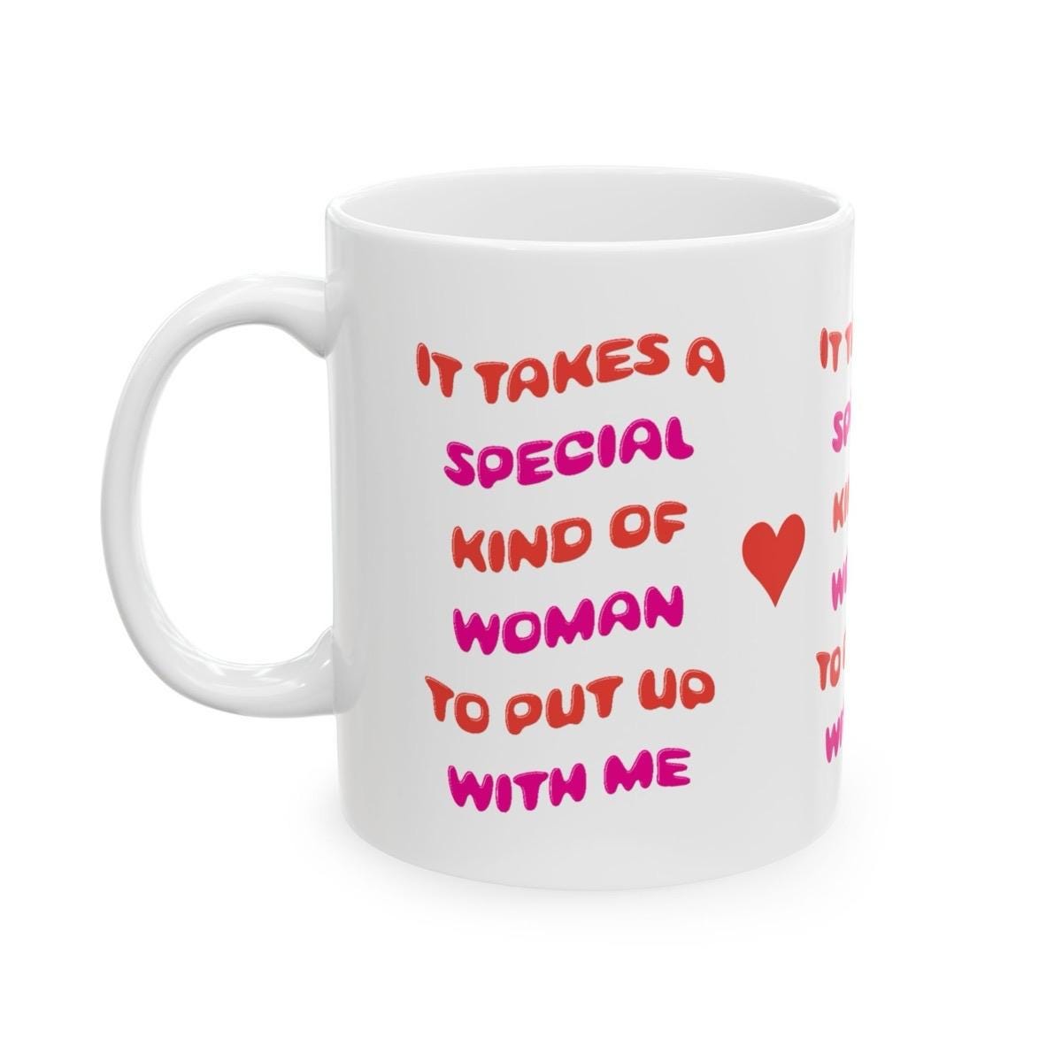 This Valentine's Day, show your special someone how much you care with this funny and cute mug gift. The mug features a unique design that reads "It Takes a Special Type of Women to Put Up with Me". This playful message is sure to bring a smile to your loved one's face and make them feel special.