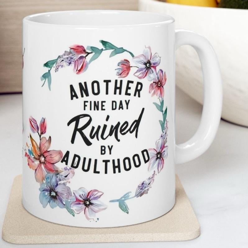 This funny sarcastic mug is the perfect addition to any morning routine. With the text "Another Fine Day Ruined by Adulthood", it's sure to bring a smile to your face and start your day off on the right foot. The sarcastic humor of the mug is sure to make you laugh and appreciate the humor in the world around you.