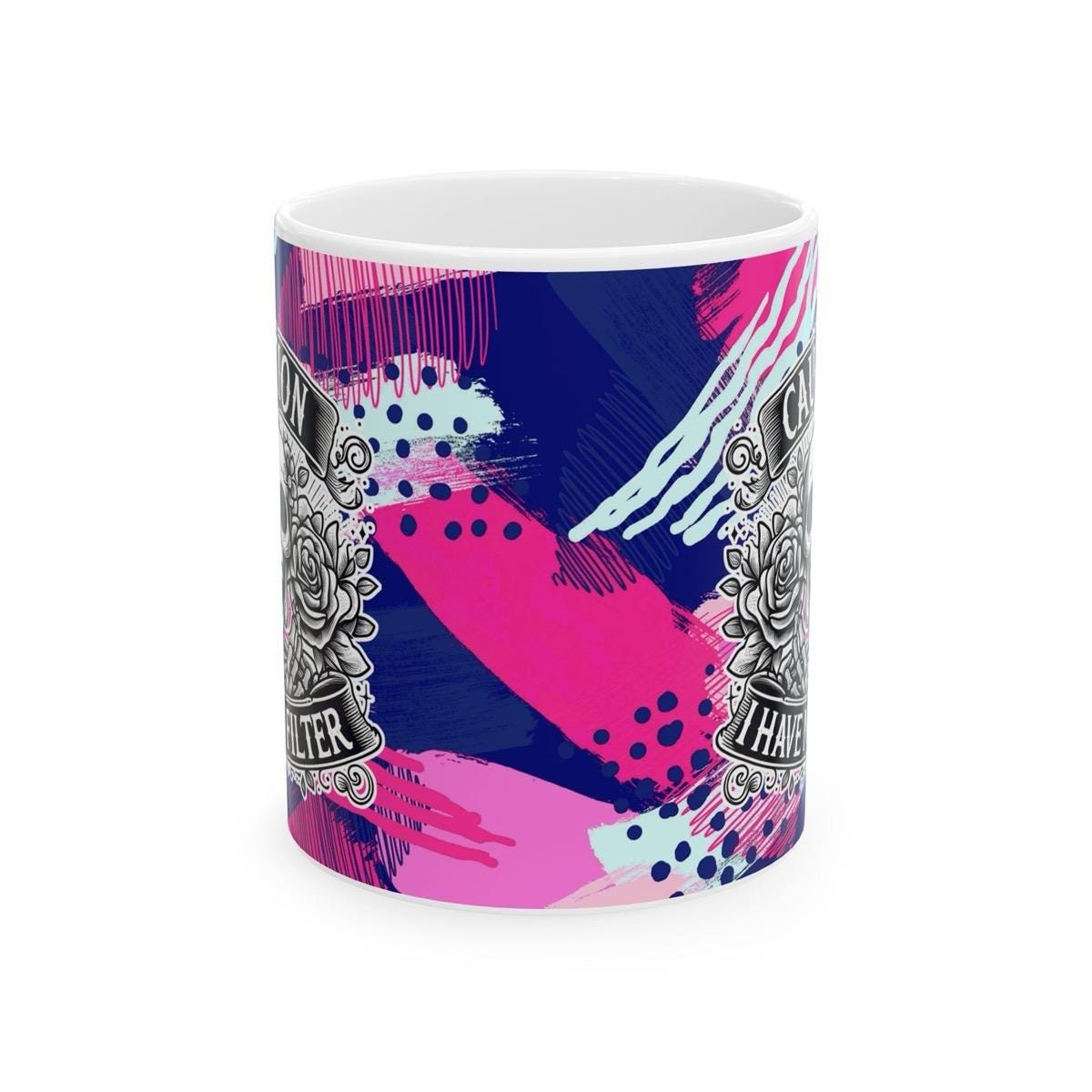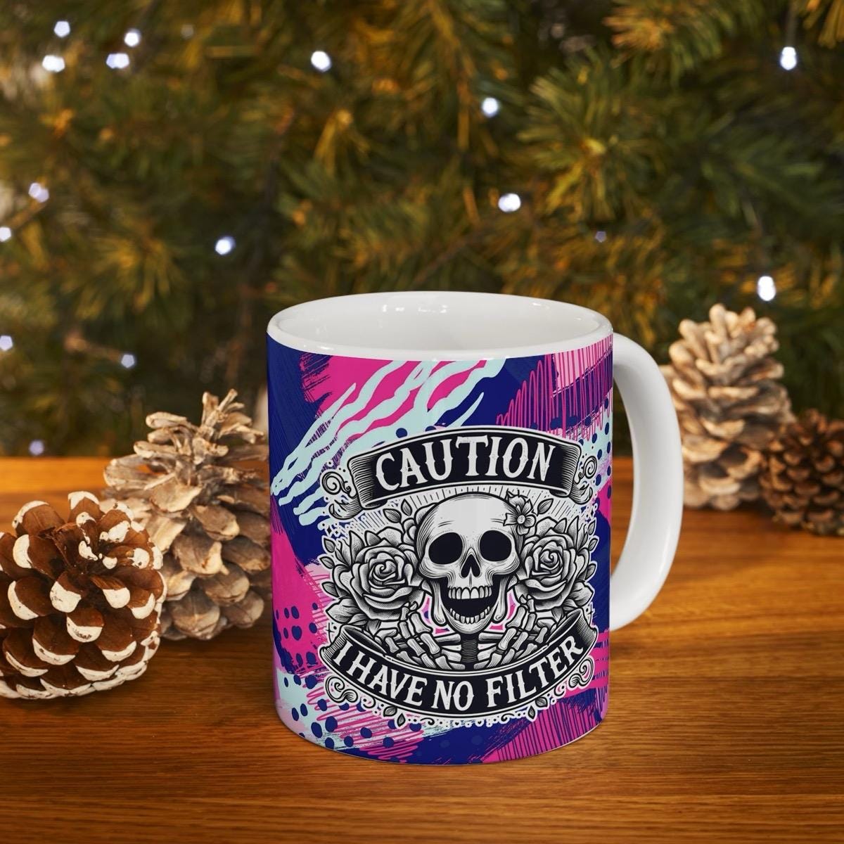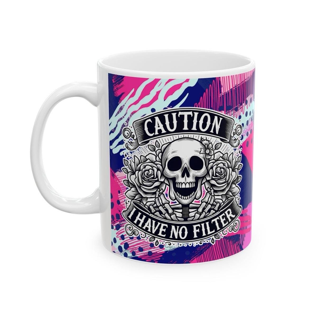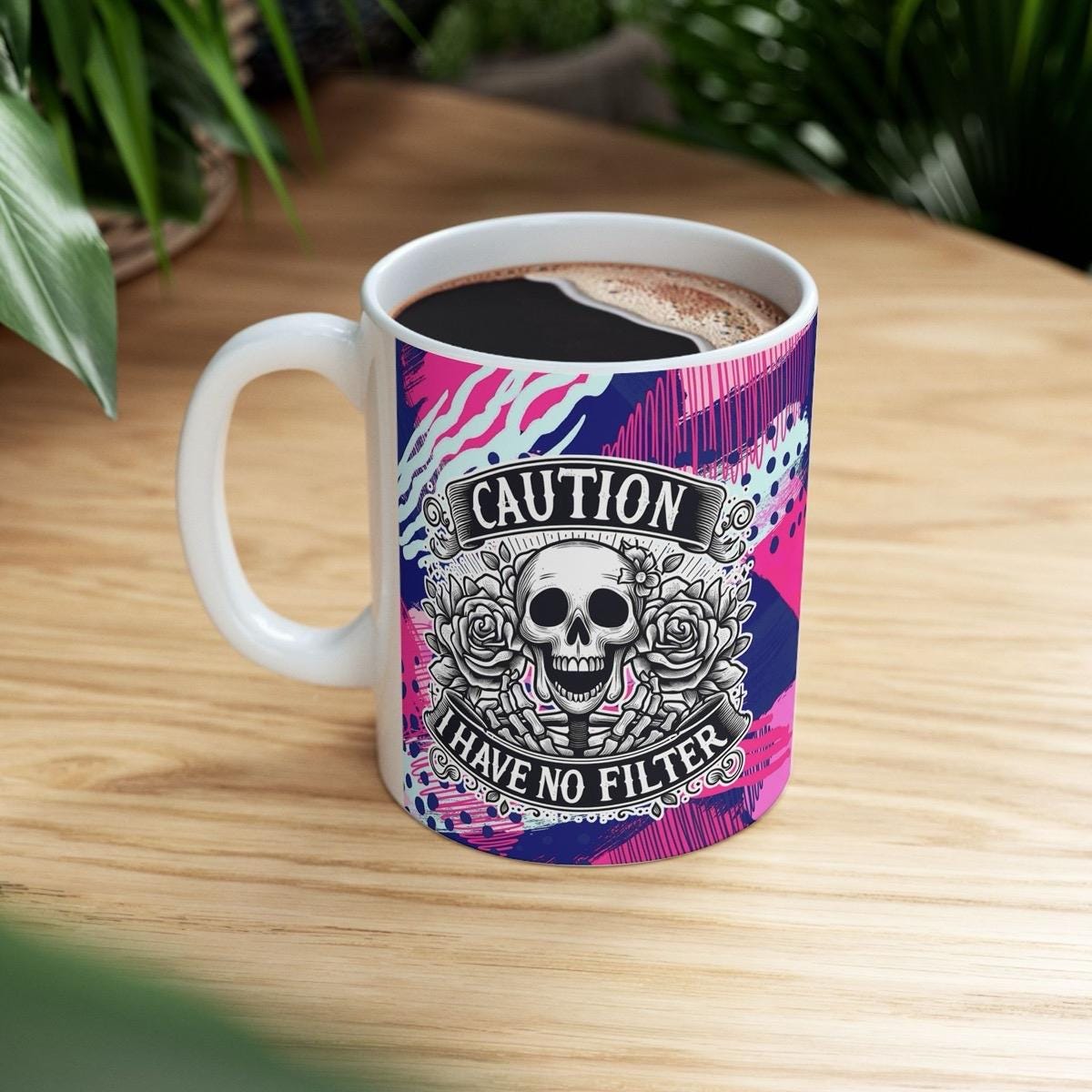 This mug is perfect for those who enjoy a good laugh and want to add a touch of humor to their morning routine. The mug features a funny skull design that is sure to bring a smile to your face. The design reads "Caution I Have No Filter" which is a sarcastic way to warn others that the person using the mug has a lack of filter and may say or do things that are offensive or inappropriate.