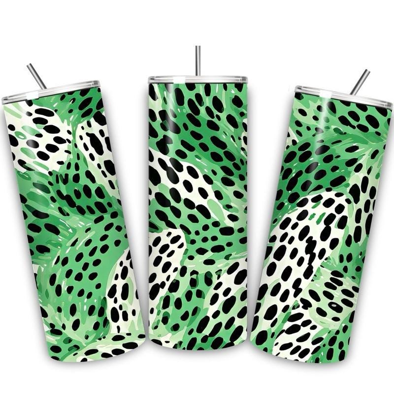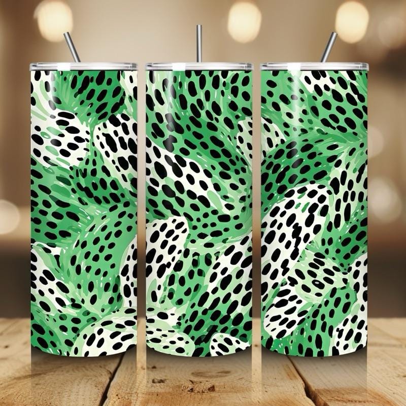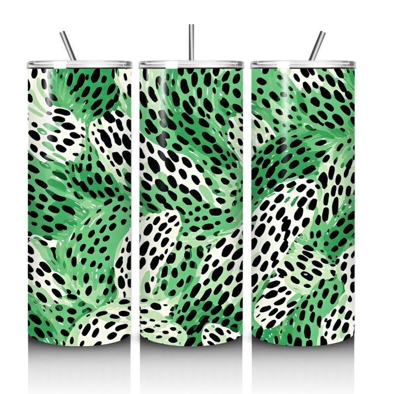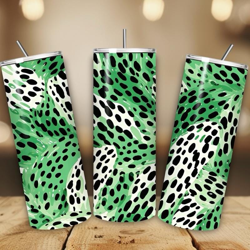 This 20oz tumbler boasts a bold green leopard print design. It's ideal for