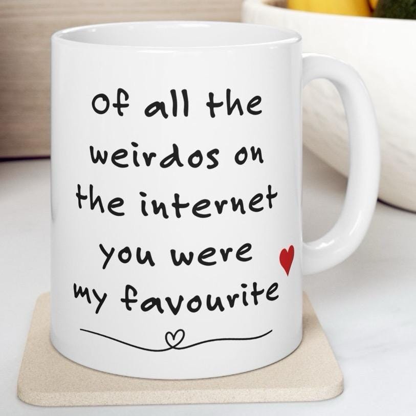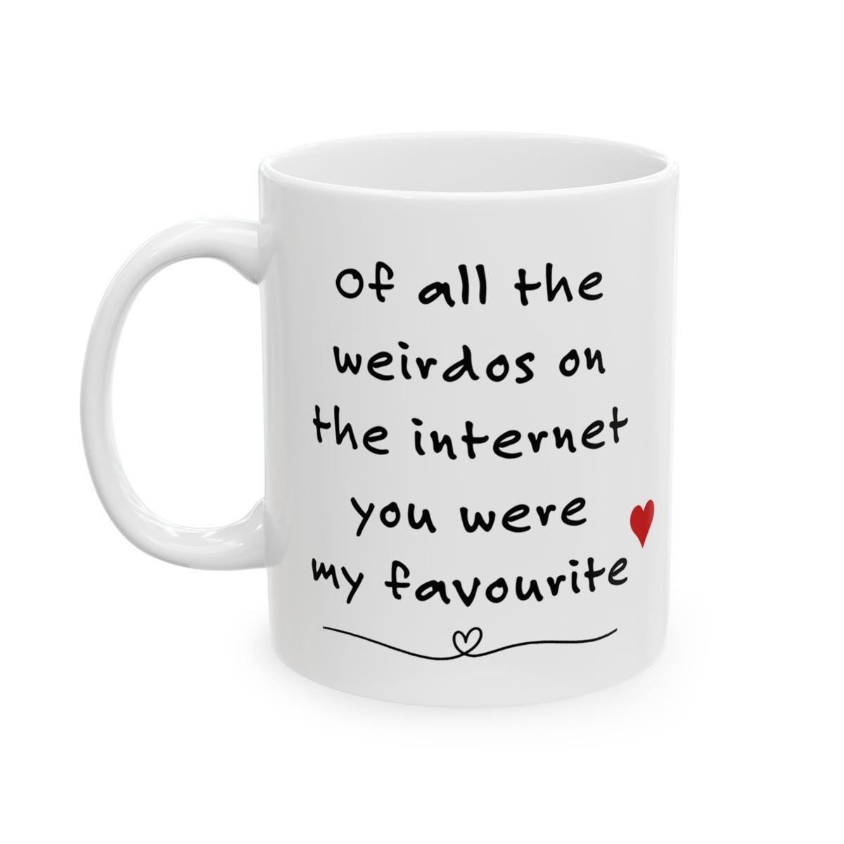 This funny mug is the perfect drinkware for Valentine's Day. The mug features the text "Of All The Weirdos On The Internet You Were My Favourite" and is a great way to show your significant other how much you care. The mug is made of ceramic and is washable and reusable, making it a great choice for those who want to reduce their environmental impact.