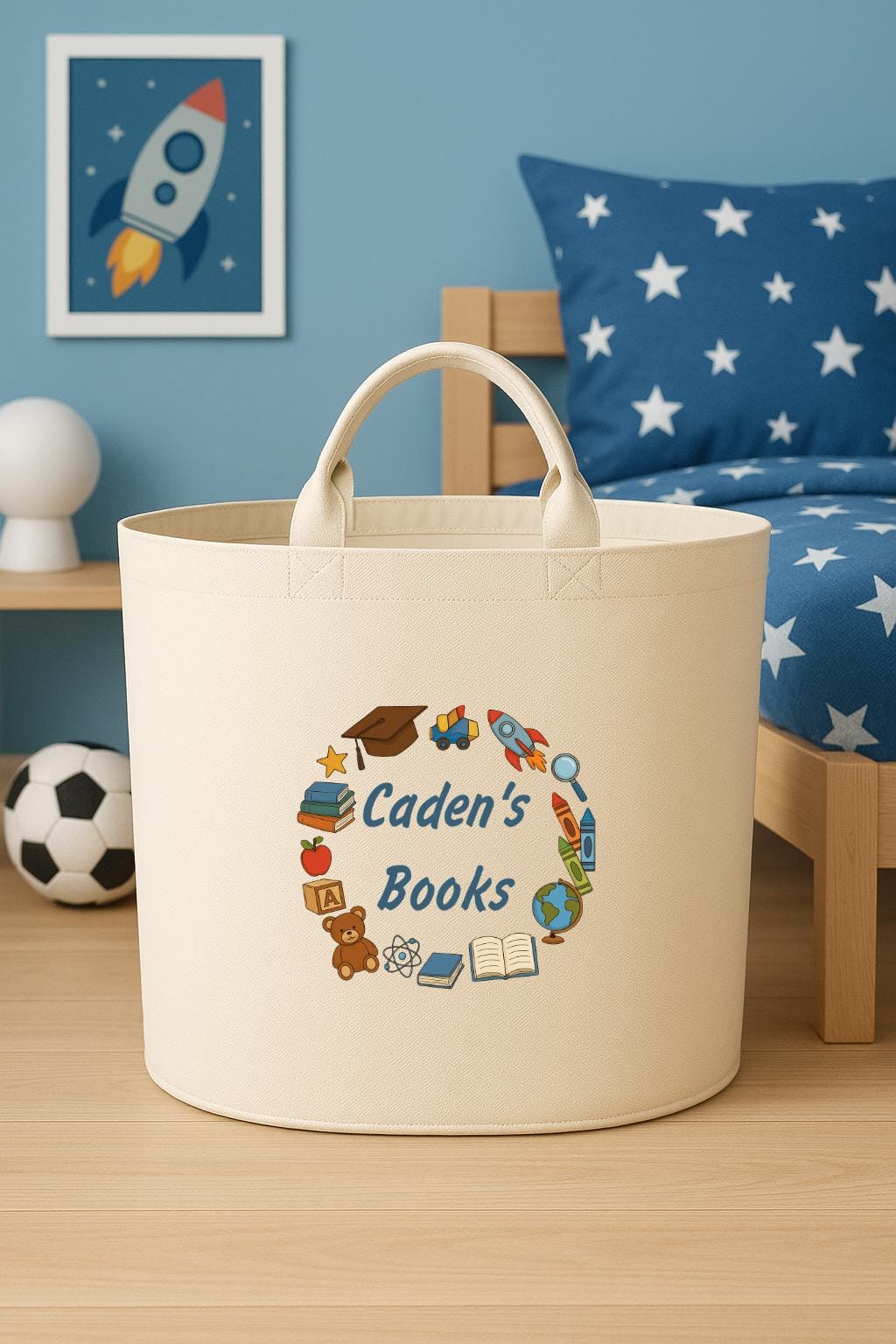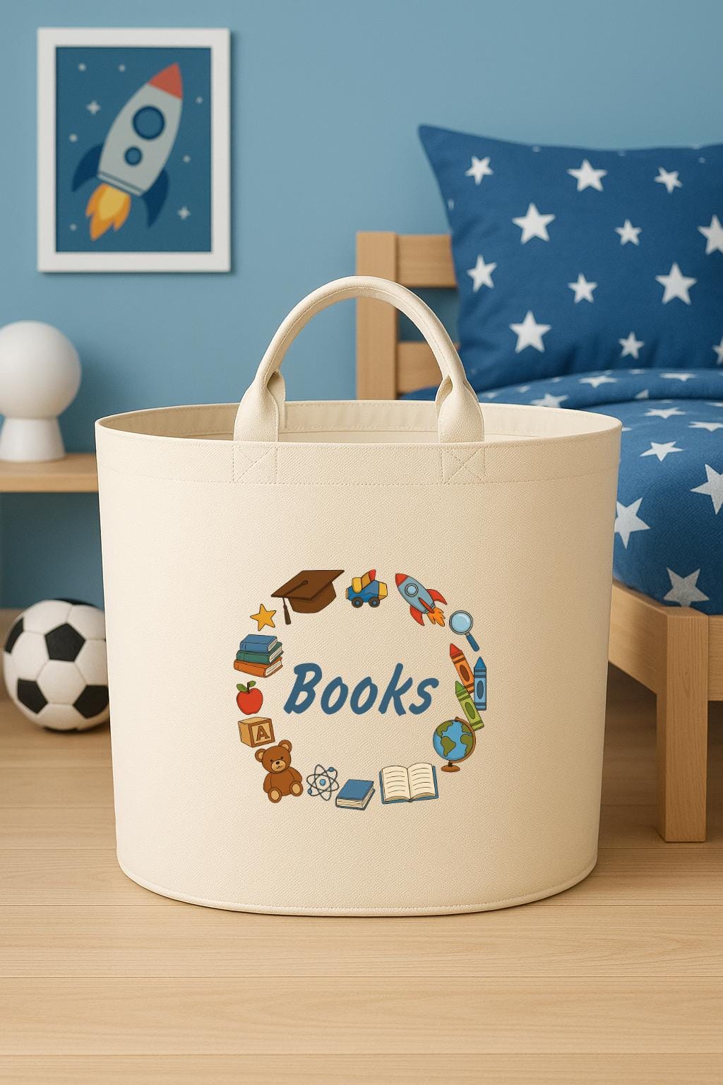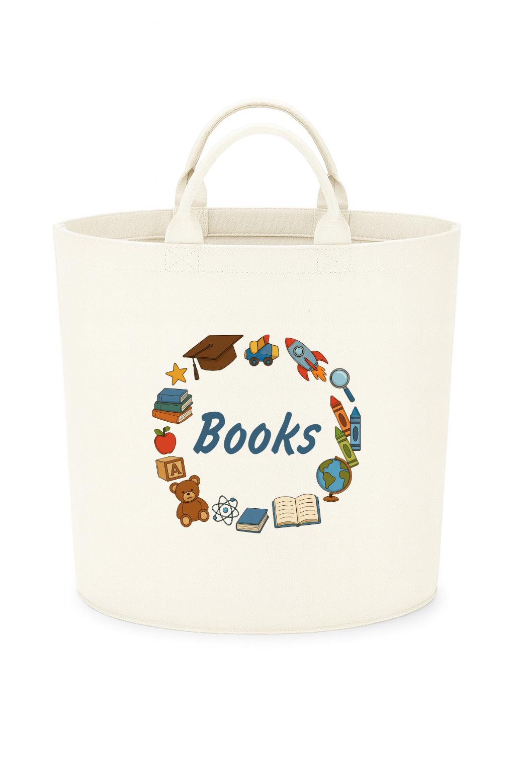 Keep books tidy and easy to find with our personalised educational-theme felt book storage bag (40x40cm). Decorated with colourful icons like rockets, crayons, globes, and books, this durable felt basket makes reading time exciting and organised.