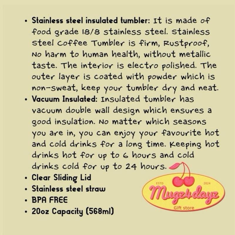 In conclusion, this personalised cute tumbler is a great gift option for anyone who loves to stay hydrated on the go. With its 20oz capacity, versatility, and personalised feature, it is a must-have for anyone who wants to add a touch of fun to their drinkware collection.