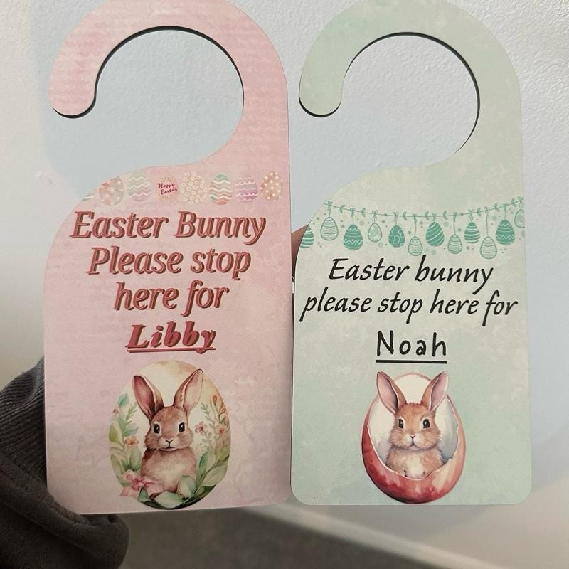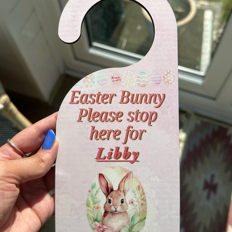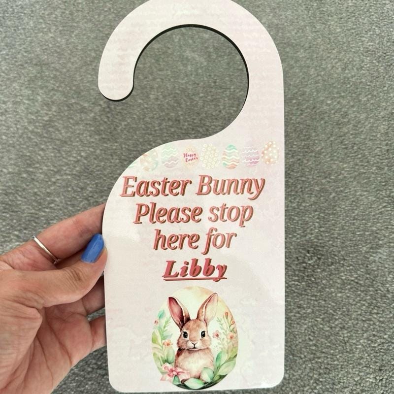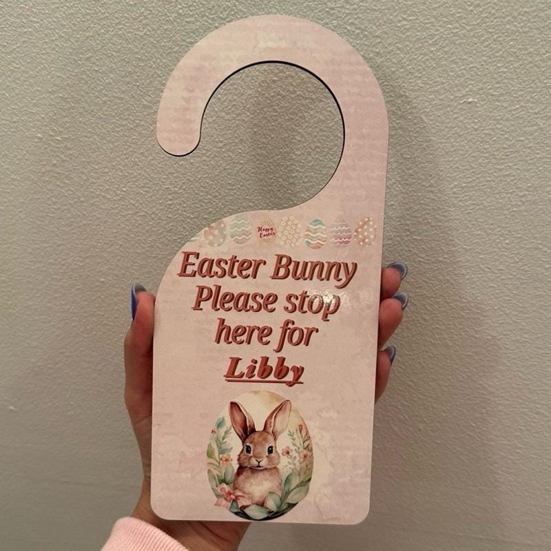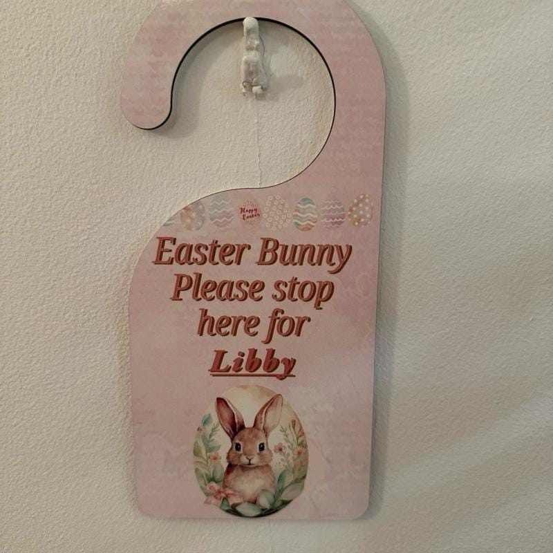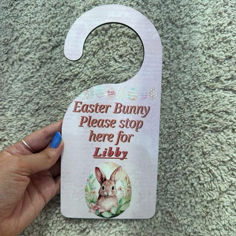 Personalised easter bunny please stop here door hanger door sign for kids - pink/blue - hangable, ornaments, hanging, decoration, decor gift
