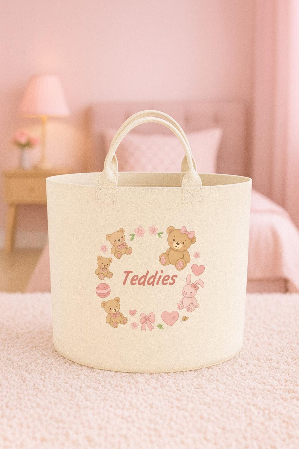 Keep soft toys and teddies neat and tidy with our personalised teddy storage bag (40x40cm). Made from durable felt, this storage basket features an adorable girly teddy design with pastel hearts, bows, and flowers. Add your child’s name or custom text to make it a unique piece for their bedroom or playroom.