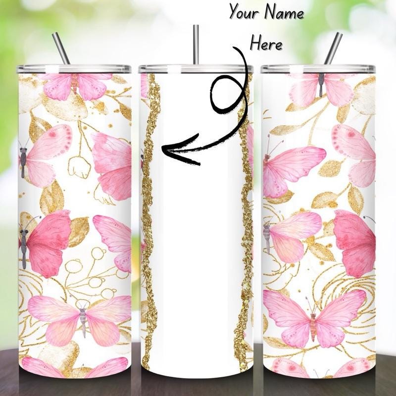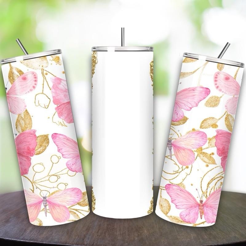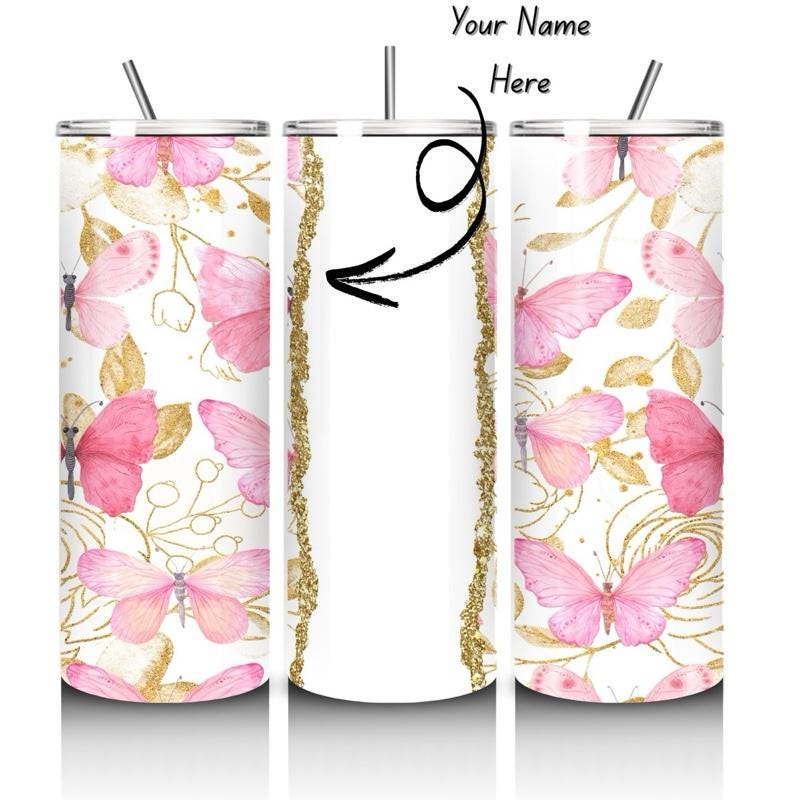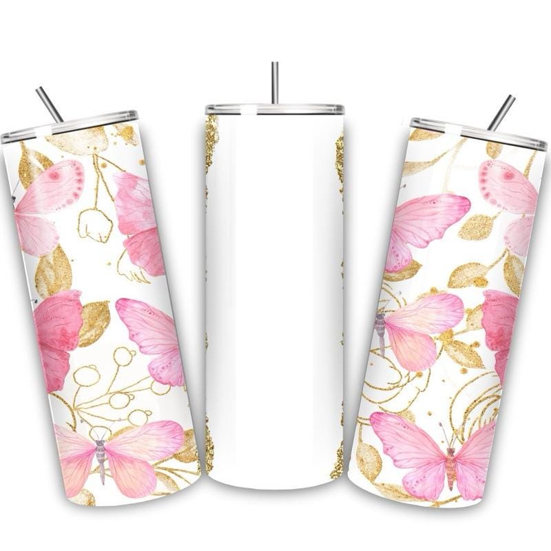 This 20oz tumbler features a charming butterfly design in gold and pink. Ideal