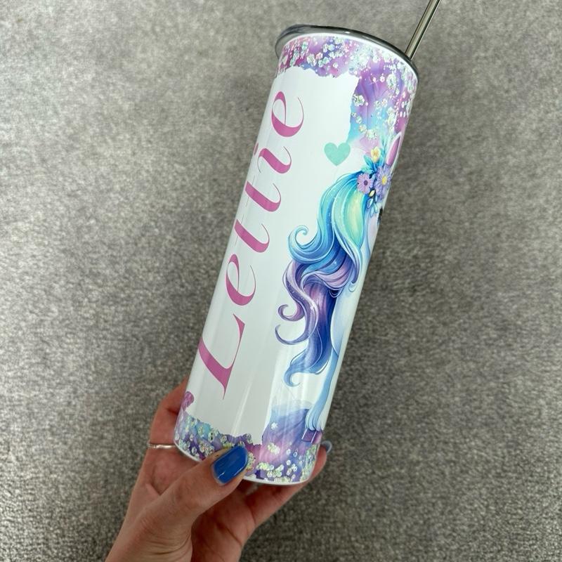 Introducing the Personalised Unicorn Tumbler, a perfect gift for kids who love unicorns. This tumbler is not only cute but also functional, making it a great addition to your drinkware collection. With a capacity of 20oz, it is perfect for holding a large amount of liquid, making it ideal for long trips or outdoor activities.