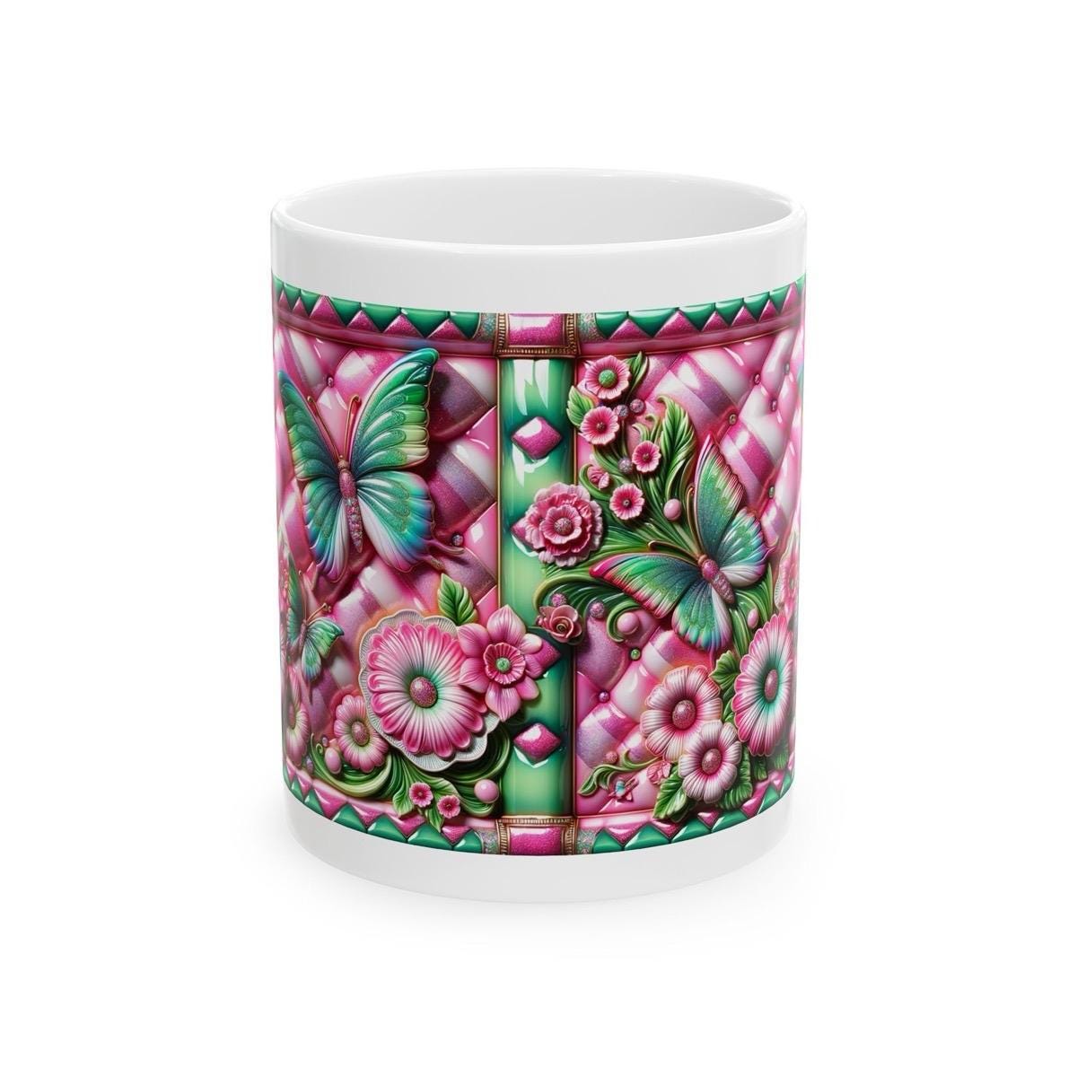 Whether you're a fan of unique designs or simply looking for a mug that stands out, the Pink Green Quilted Butterfly Flower 3D Mug is a great choice. Its quilted design, butterfly and flower patterns, and 3D effect make it a unique and visually appealing addition to your mug collection.