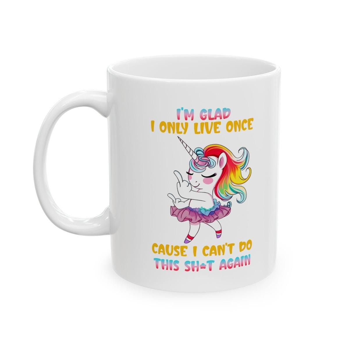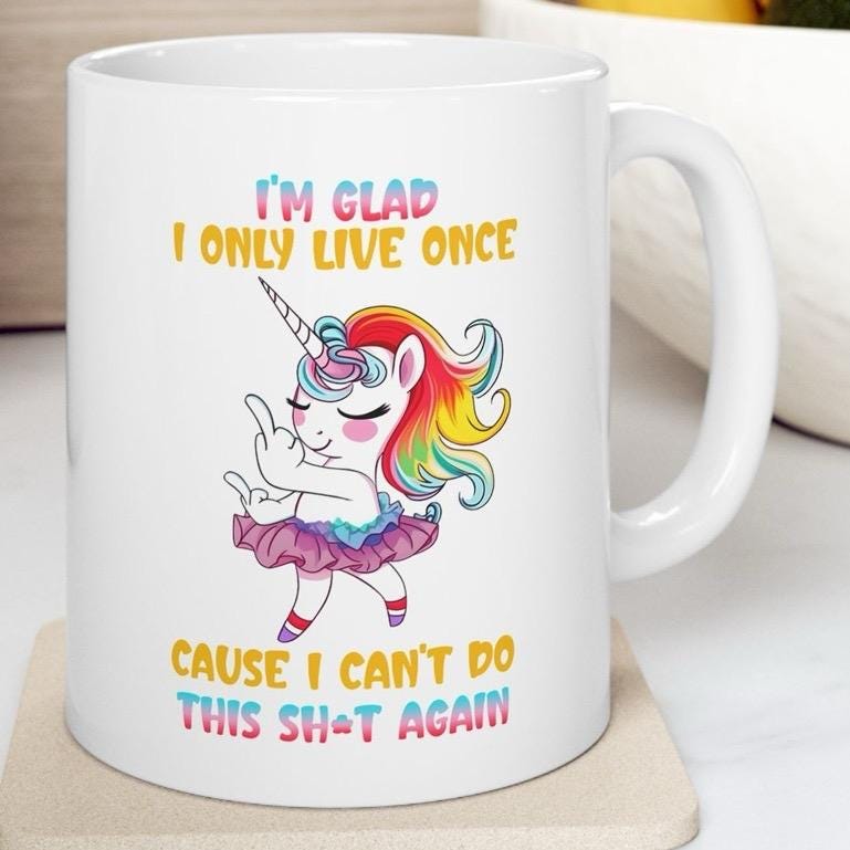 This sarcastic funny rude mug is a great addition to any coffee lover's collection. The mug features the text "Glad I Only Live Once" and is perfect for those who appreciate a good laugh. It is a great secret Santa stocking filler or Xmas birthday gift for anyone who enjoys a good joke.