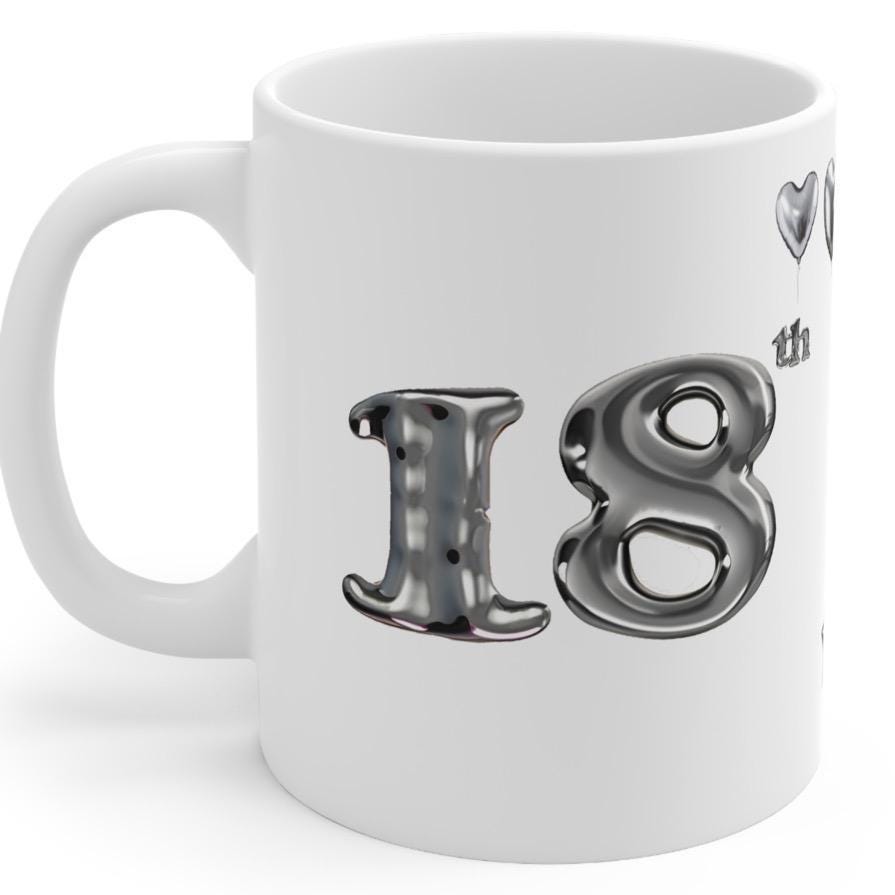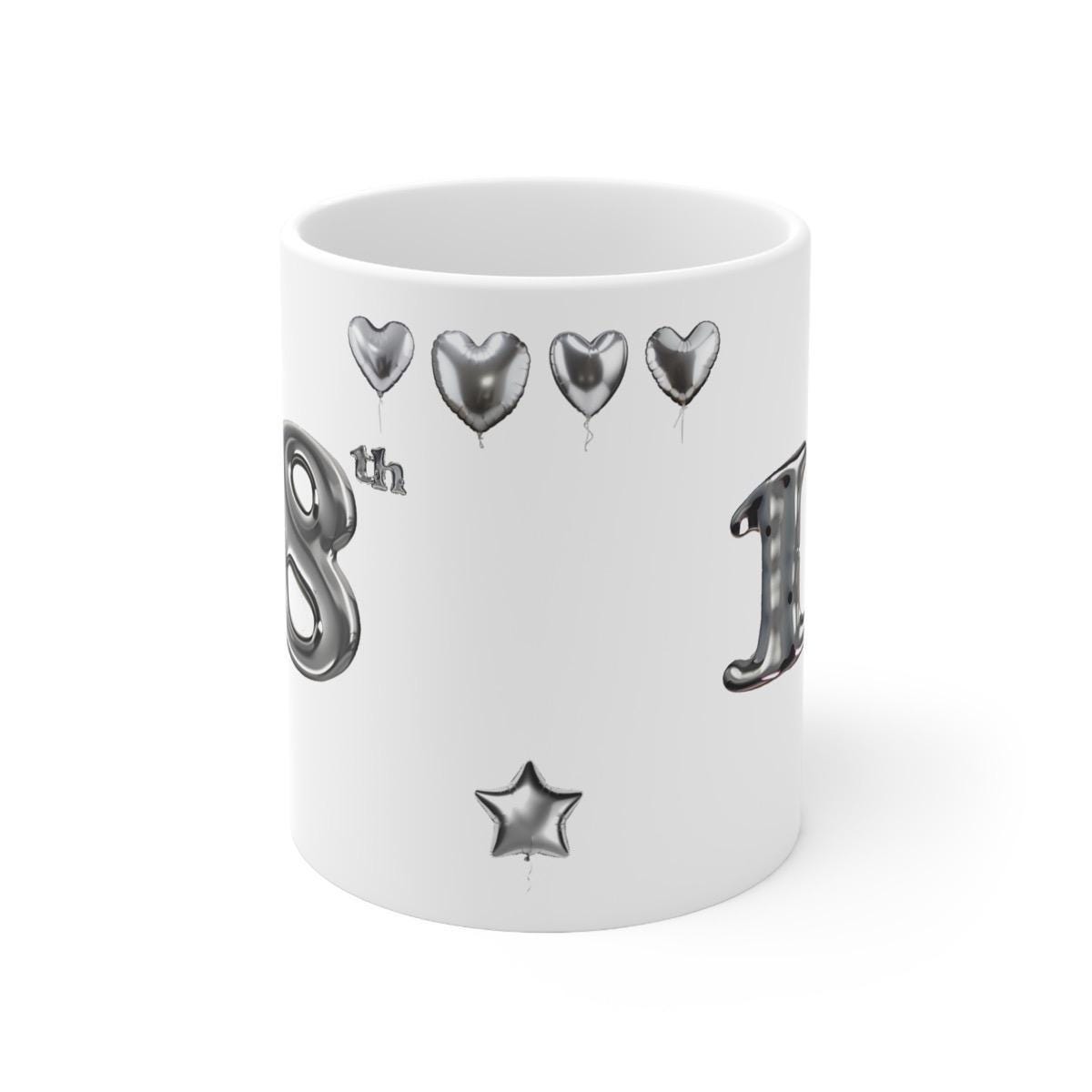 Silver 18th birthday mug gift - perfect for celebrations - cup, drinkware tumblers ceramic washable coffee reuse reusable cute him her 18 cu