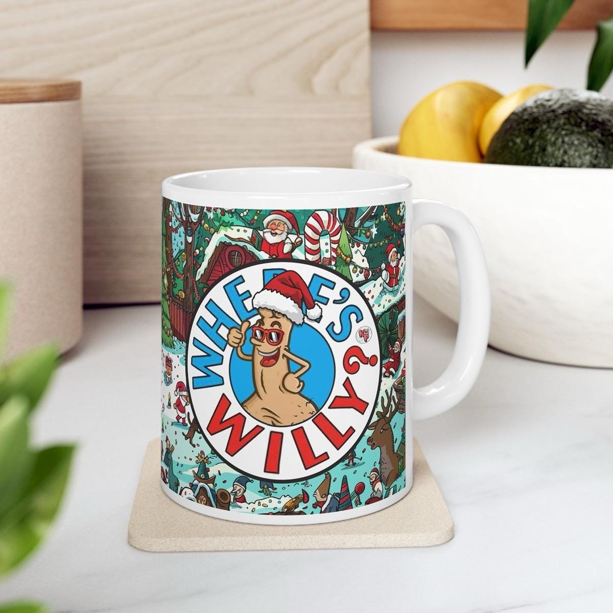 The mug is a great way to start your day with a laugh. The "Where's Wil Wally Style Mug" is a funny and rude mug that is sure to bring a smile to your face. The design is perfect for those who want to add a bit of humor to their morning routine.