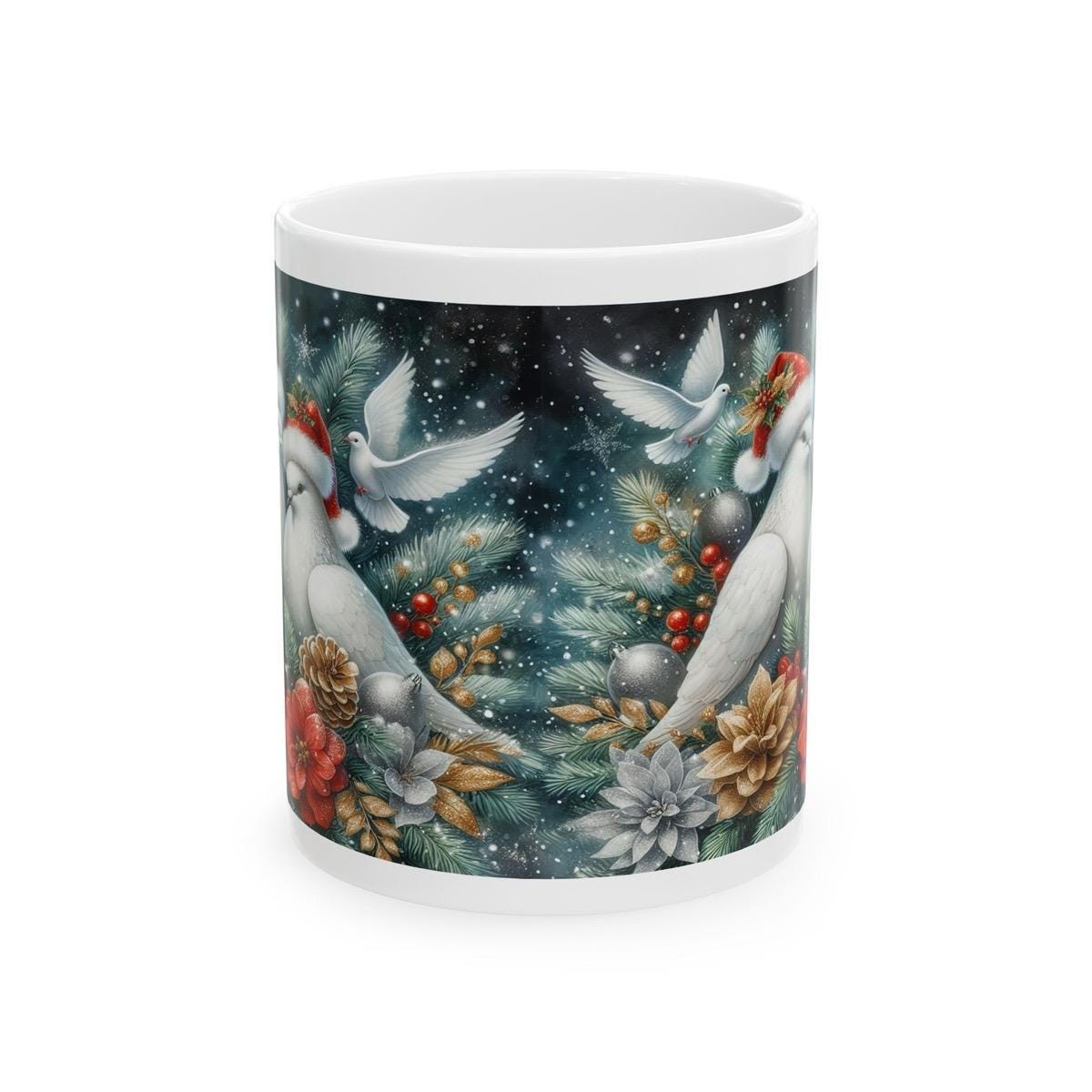This Christmas mug is a perfect addition to your holiday season. The mug features a beautiful design of white doves, which can be a symbol of peace and love during the holiday season. The white doves design is eye-catching and adds a touch of elegance to your holiday decor.