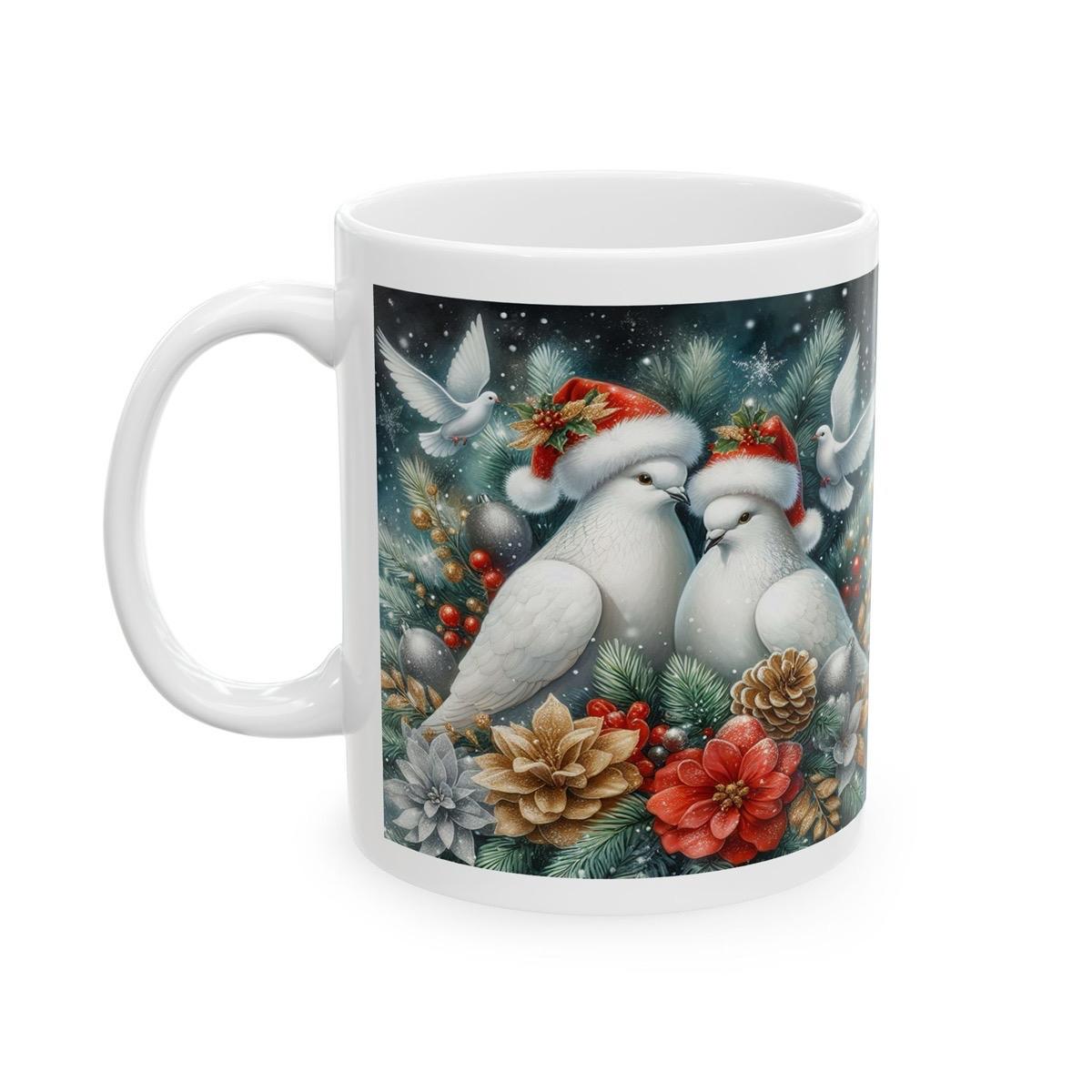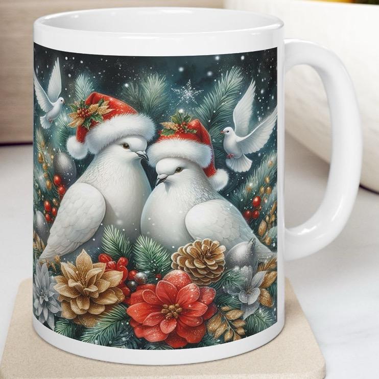 White doves christmas mug - perfect for hot beverages - tumblers, drinkware reusable cup washable reuse ceramic coffee xmas mugs tea festive