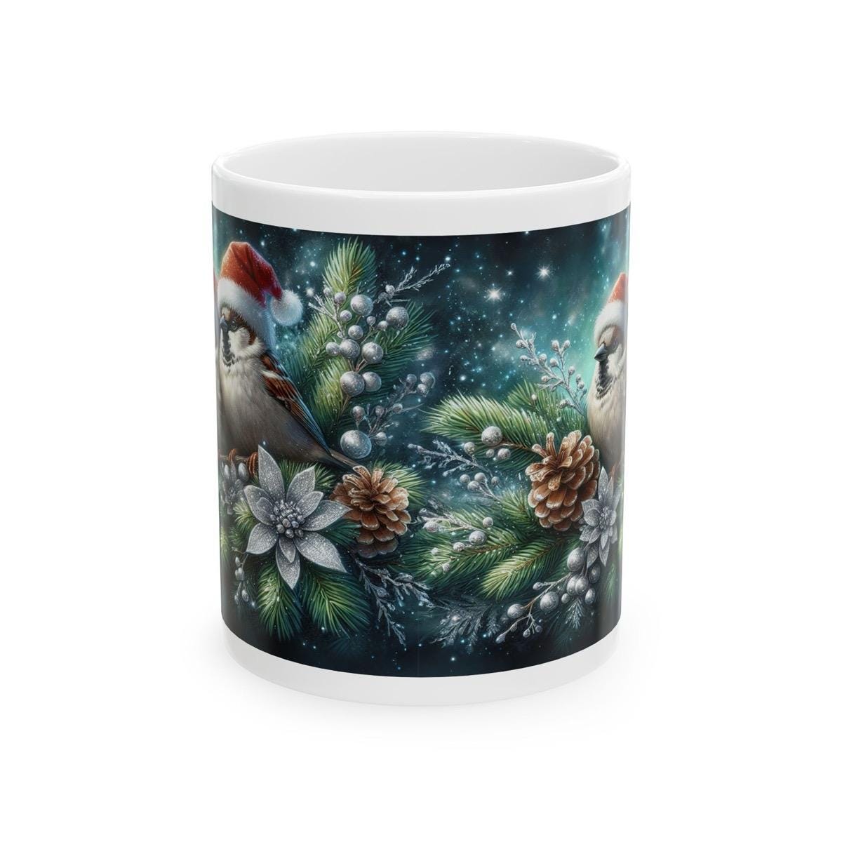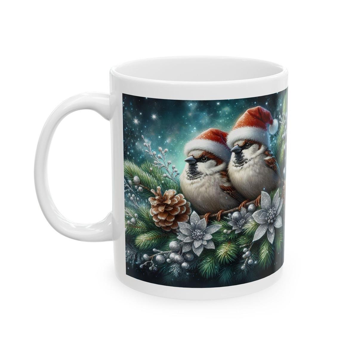 The design of the mug is inspired by the winter season, with a snowy background and a Christmas tree in the foreground. The birds are depicted in a playful and whimsical way, adding a touch of fun to the mug.