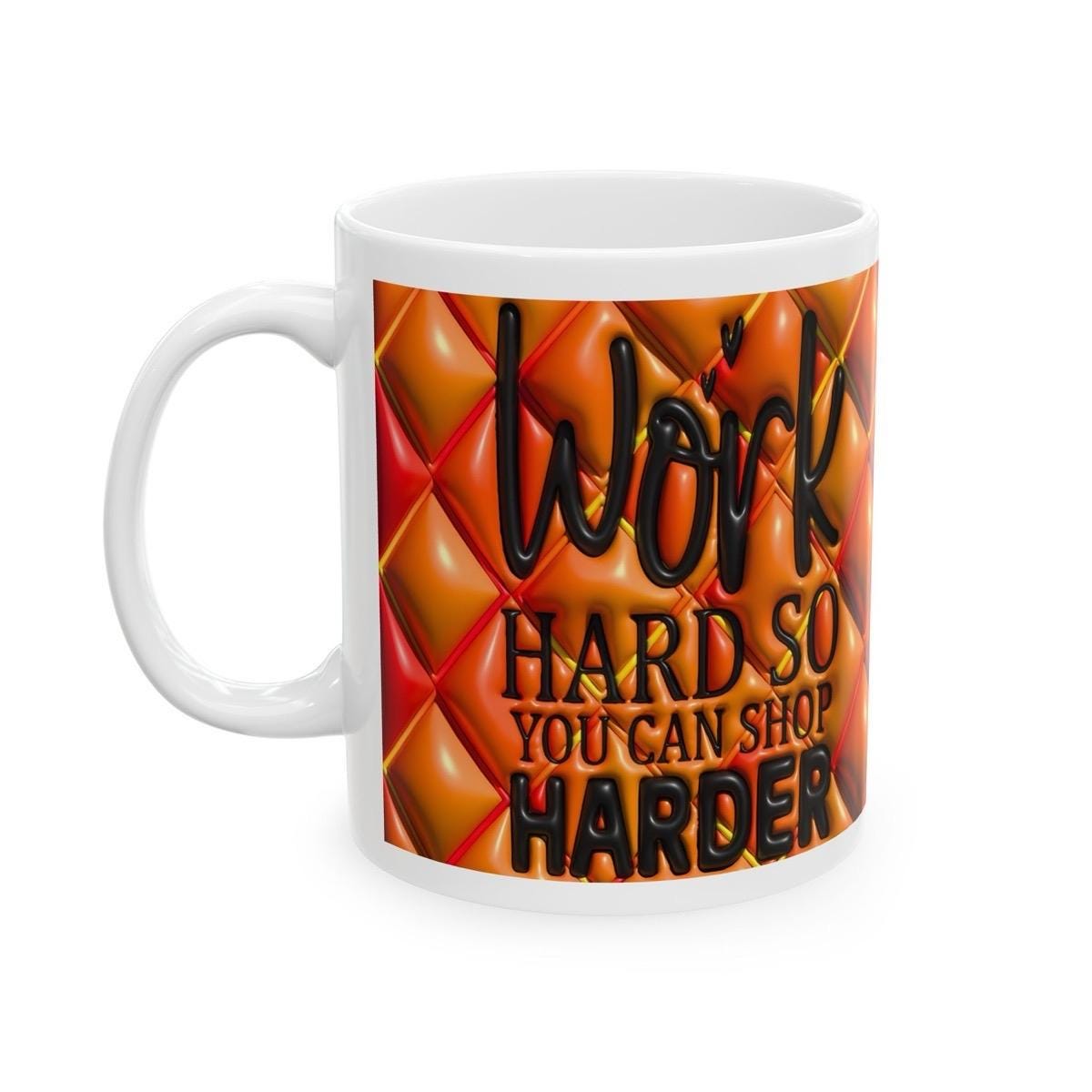 Introducing the "Work Hard" mug, the perfect drinkware for office use. This reusable and washable coffee mug is made of ceramic, making it durable and long-lasting. The mug is designed to be used for coffee, but it can also be used for other beverages such as water or tea.