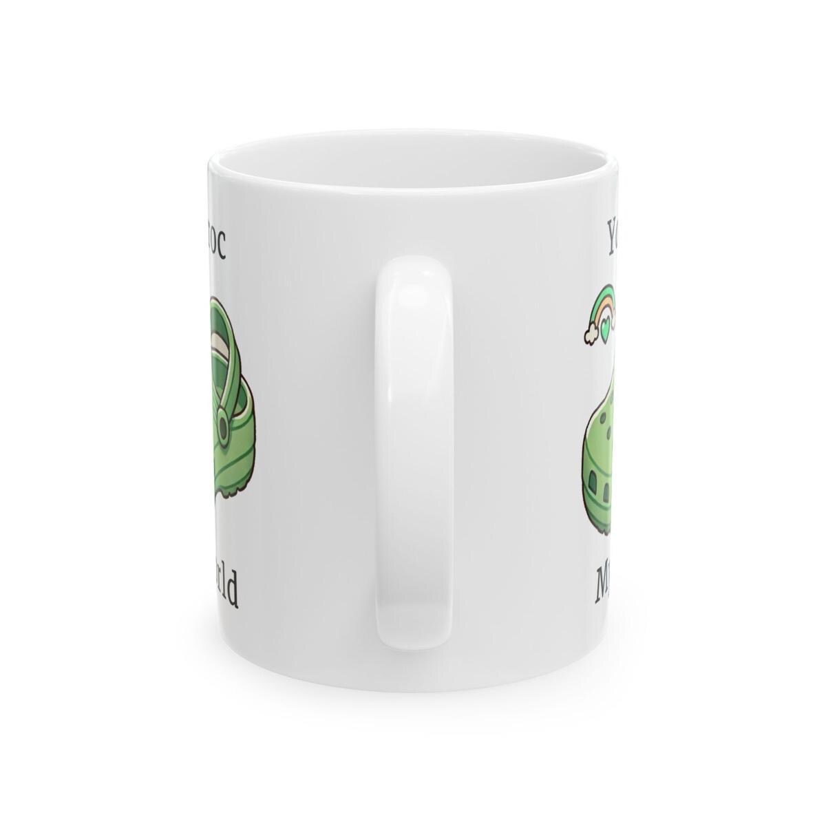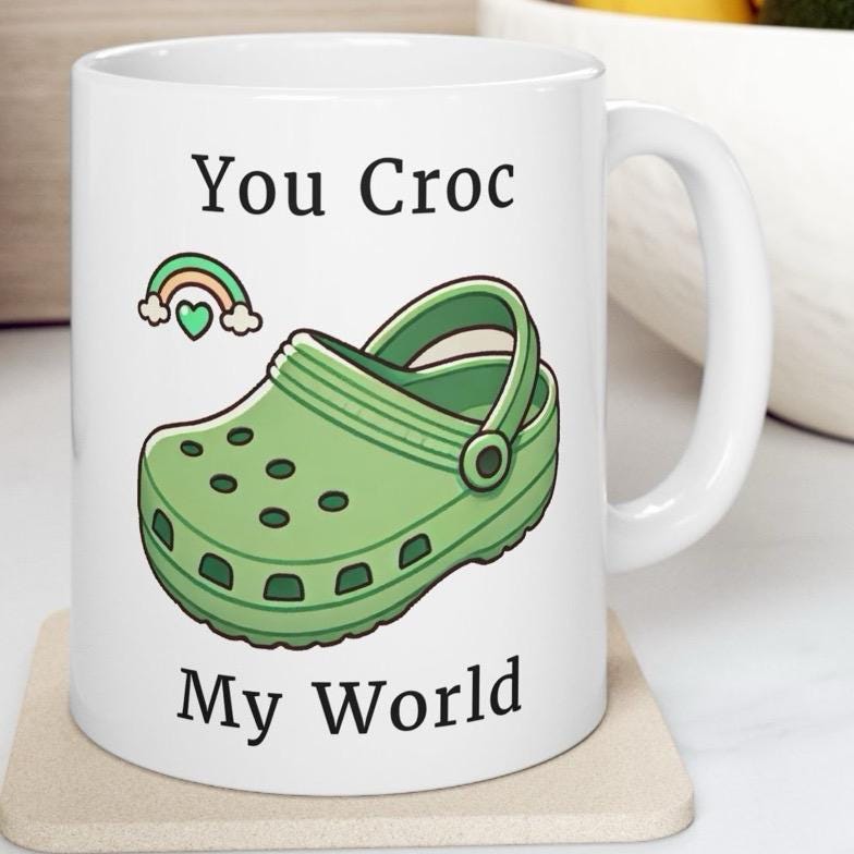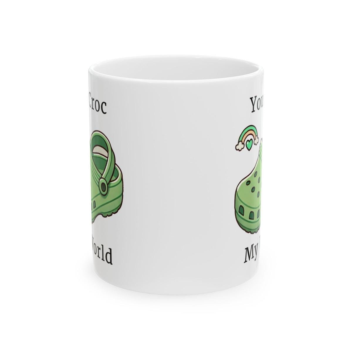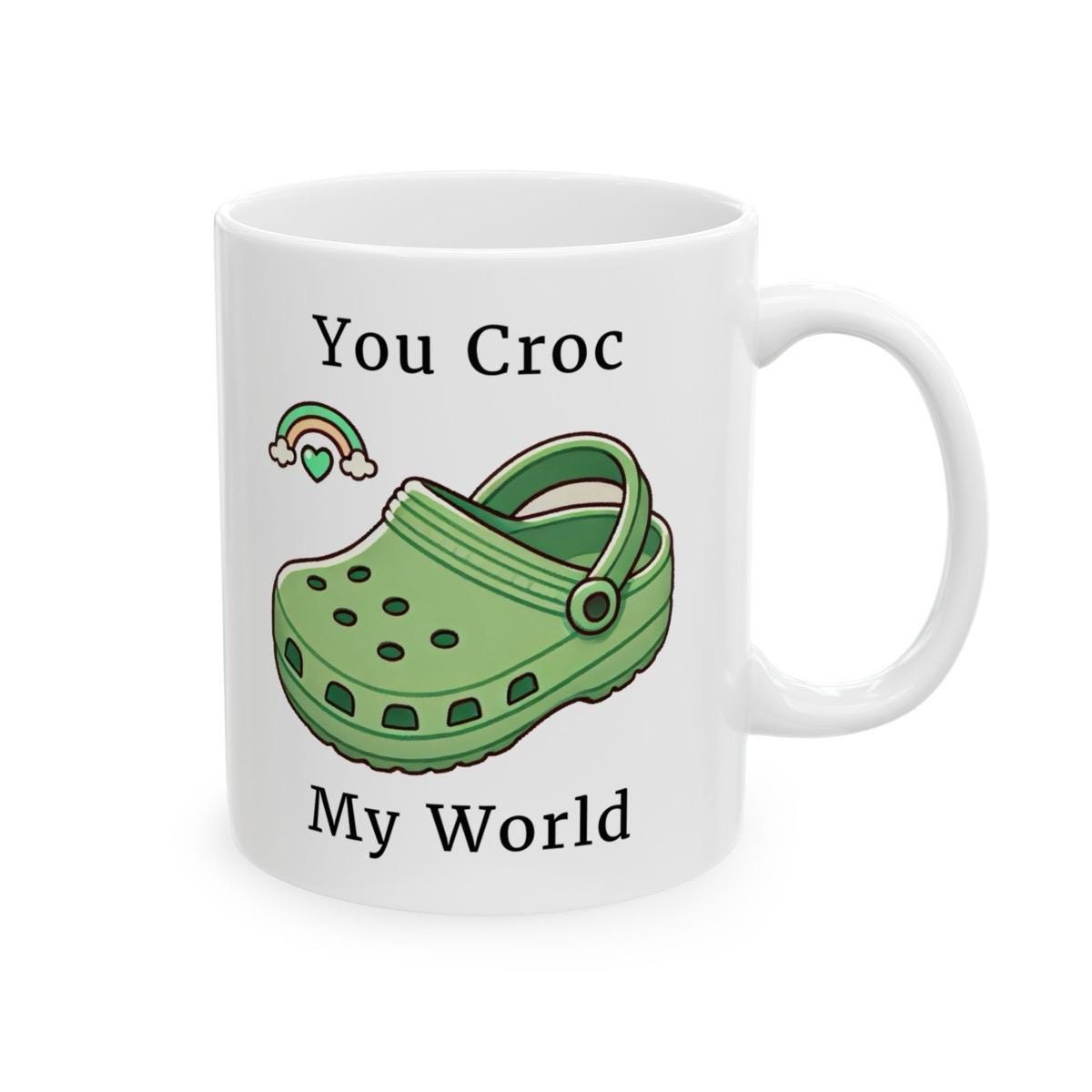 The mug's design is a playful and humorous way to express your feelings towards your significant other. The text on the mug reads "You Croc My World" and is sure to bring a smile to anyone's face.